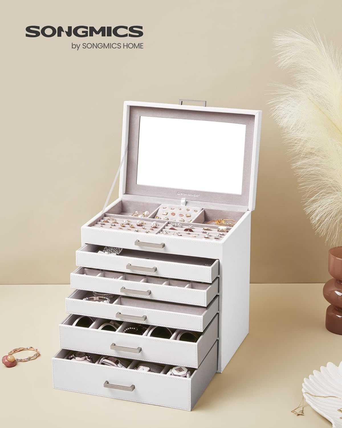 SONGMICS Cutie de bijuterii din MDF cu 6 nivele, 5 sertare, cu oglinda 31x32x22cm, alb Household NewTrend