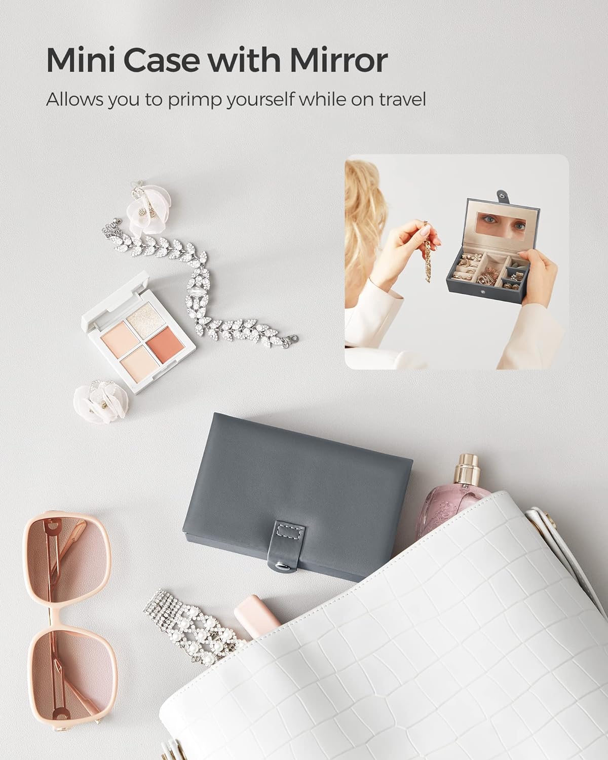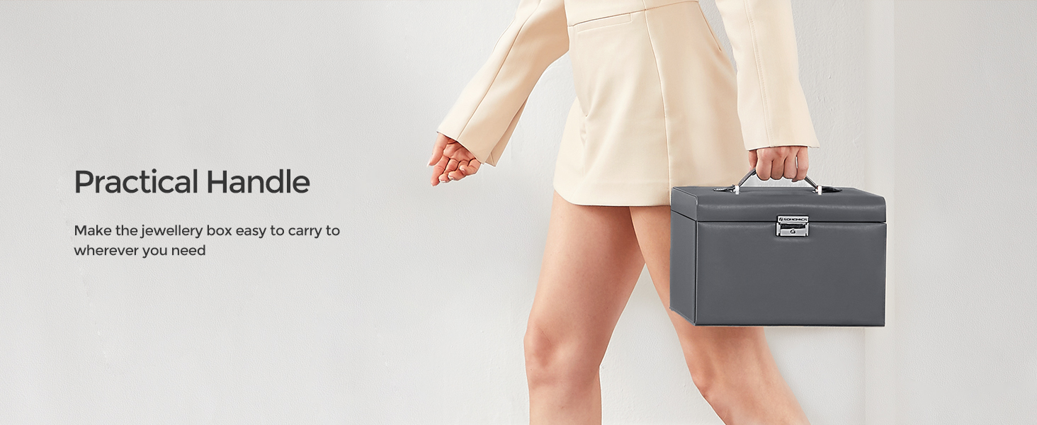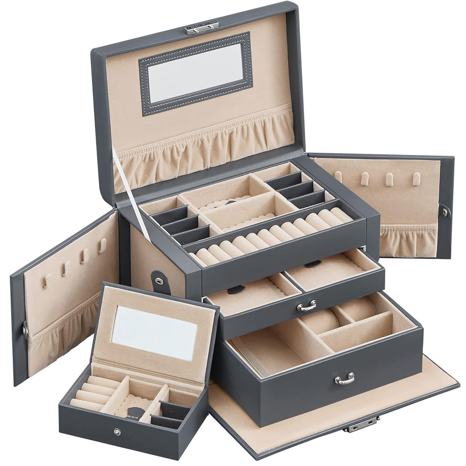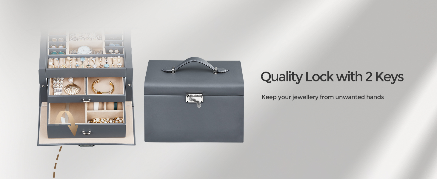 SONGMICS Cutie de bijuterii pe 3 nivele, cu 2 sertare, maner, oglinda, inchidere cu cheie, 18x26x17, gri Household NewTrend