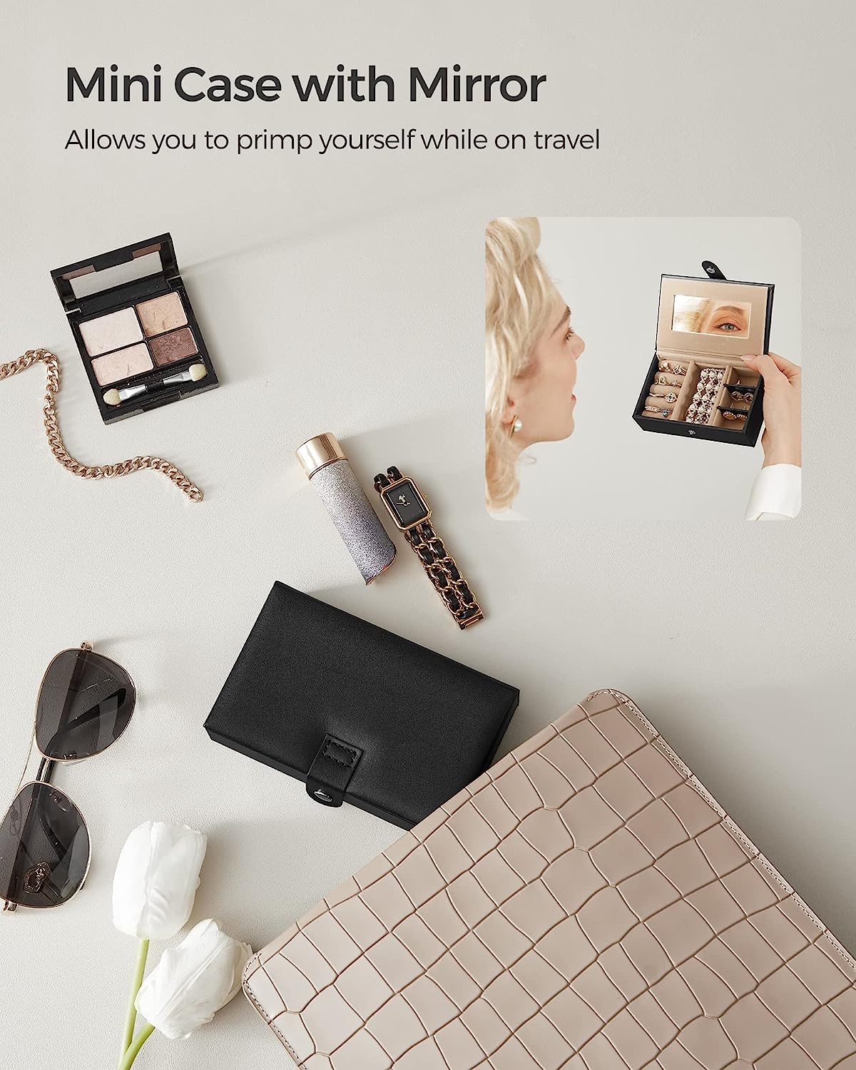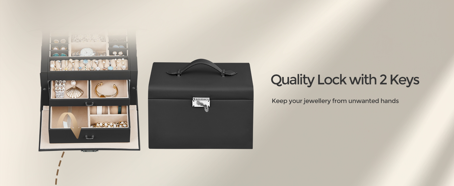 SONGMICS Cutie de bijuterii pe 3 nivele, cu 2 sertare, oglinda, maner, inchidere cu cheie, 18x26x17cm, negru Household NewTrend