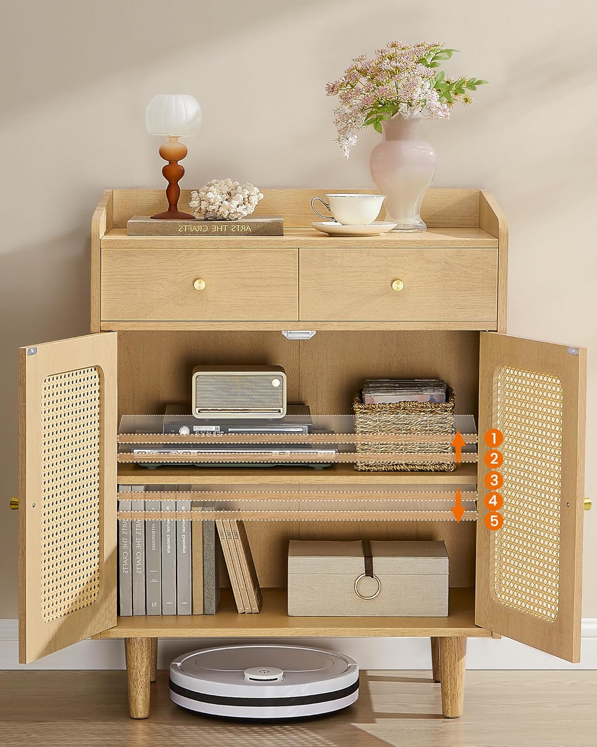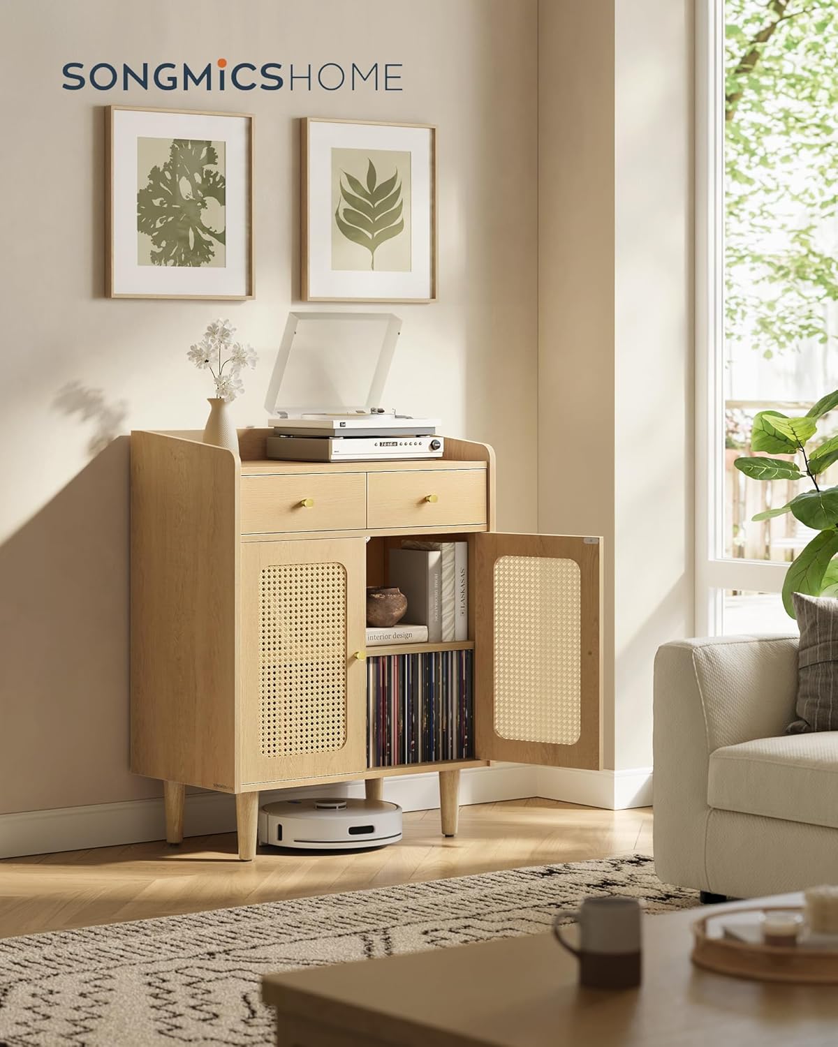 SONGMICS Dulap 70x40x90 cm, cu 2 sertare, raft reglabil si usi duble, MDF si lemn masiv, stil boho, stejar bej Household NewTrend