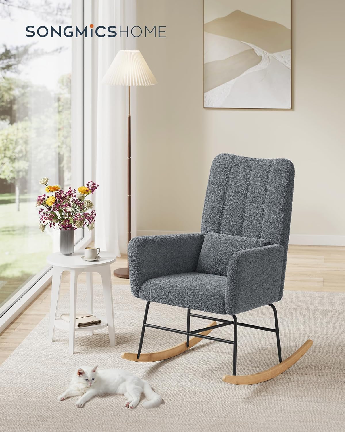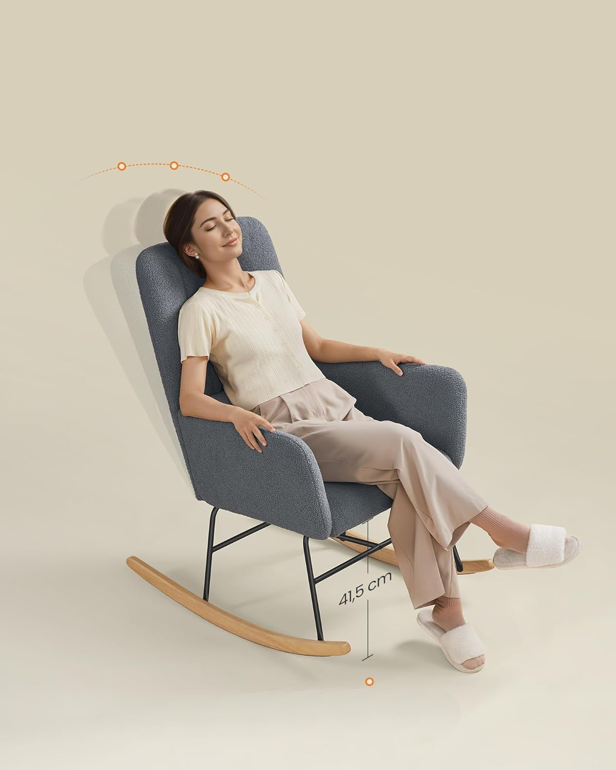 SONGMICS Fotoliu balansoar cu brate, cadru otel imbracat in fleece si picioare din lemn, 136 kg, gri Household NewTrend