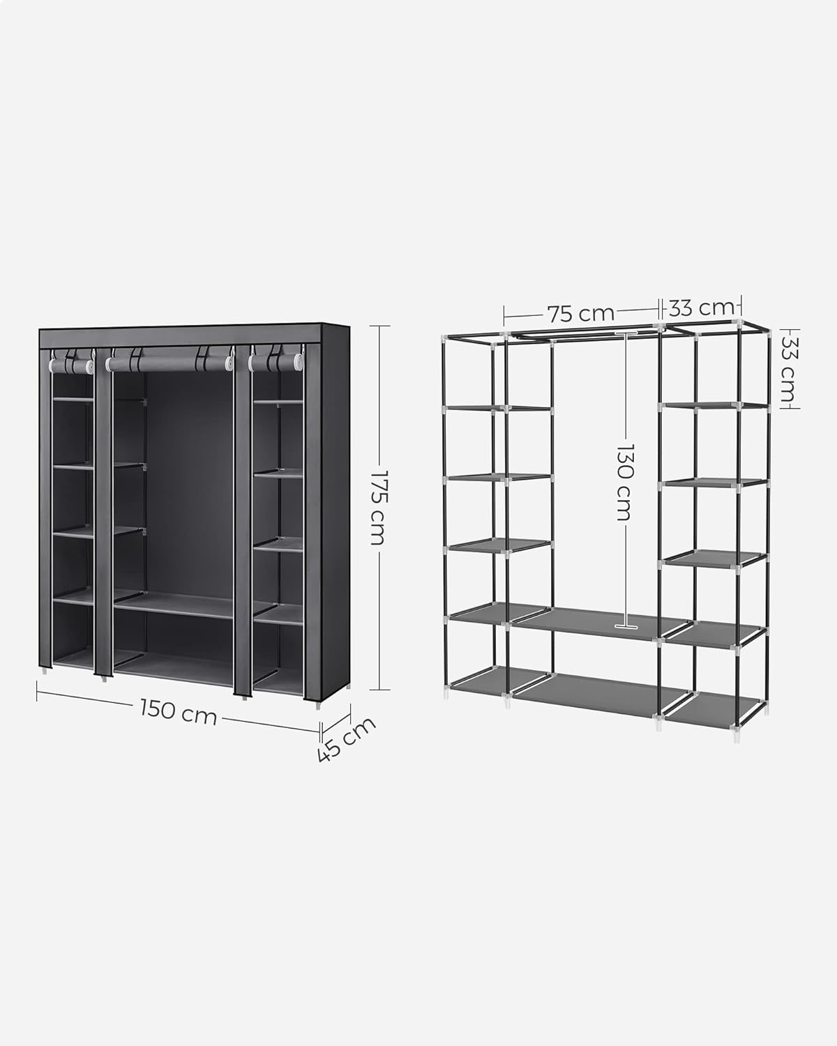SONGMICS Garderoba din material textil, dulap portabil, cu rafturi si sina de agatat, 150x45x175cm, gri Household NewTrend