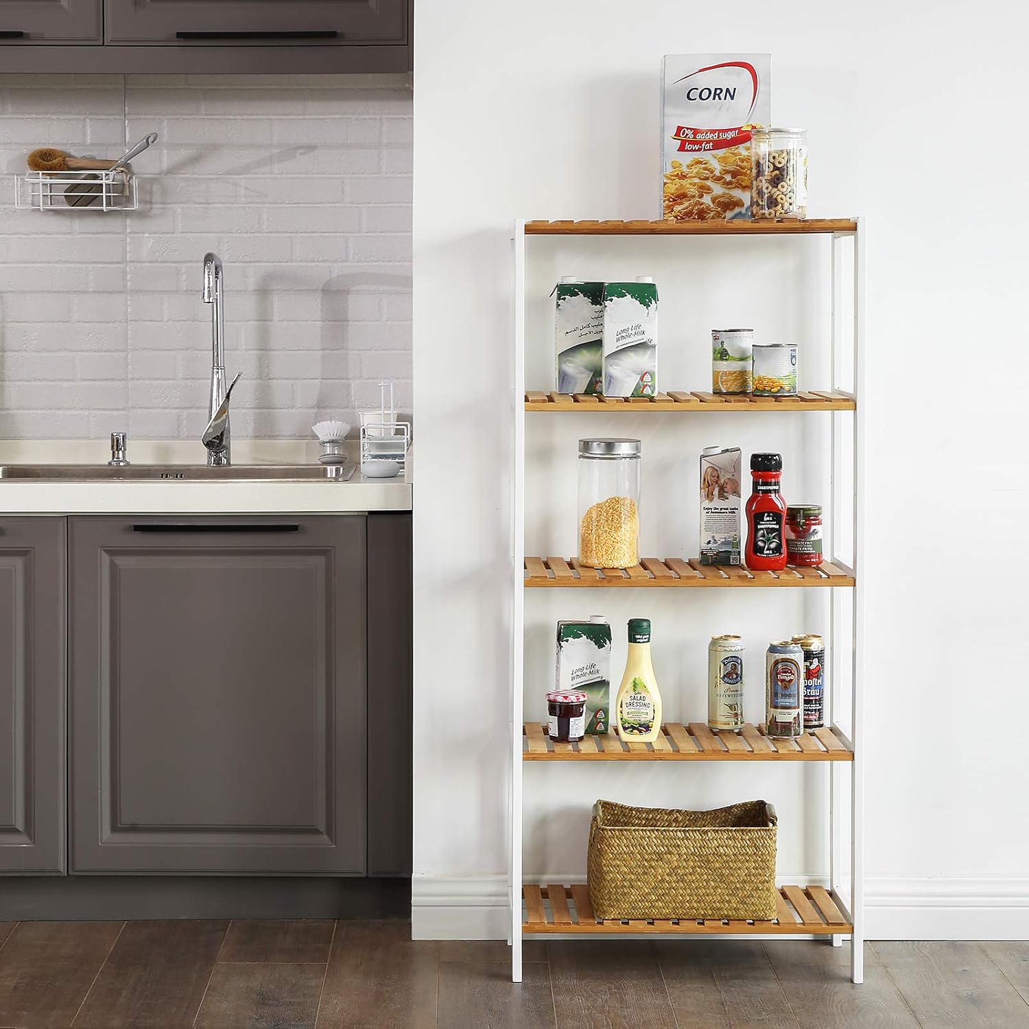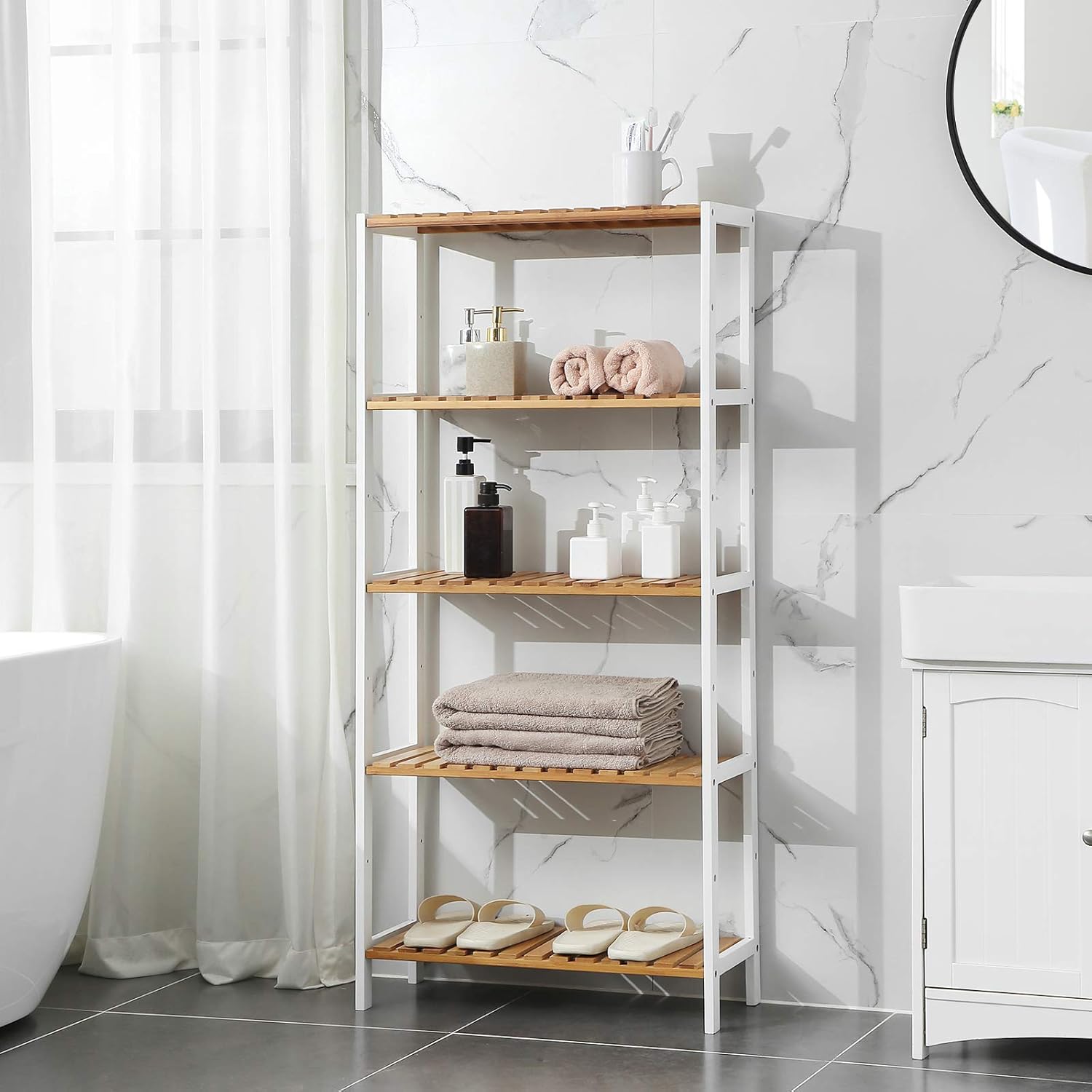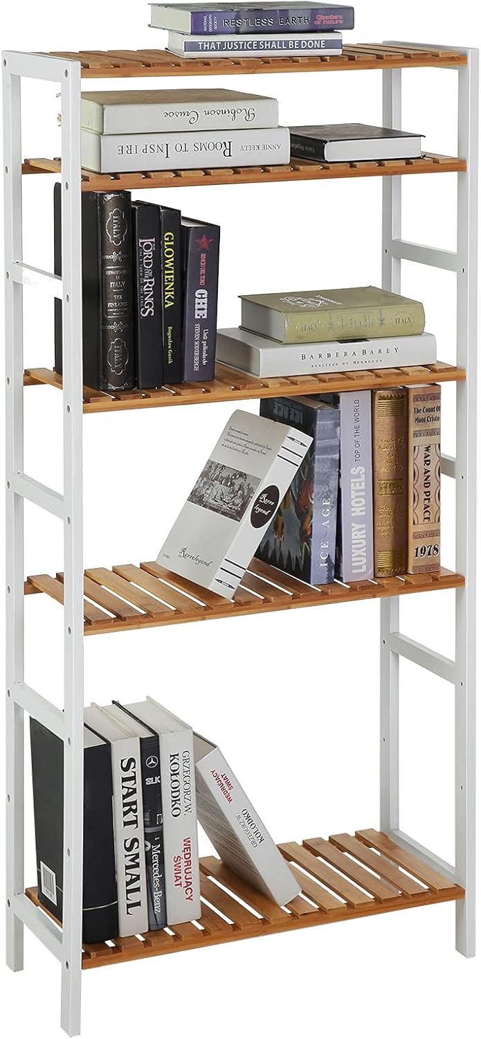 SONGMICS Raft de depozitare din bambus, 5 polite, pentru bucatarie sau baie, 130x60x26cm, alb si maro natur Household NewTrend