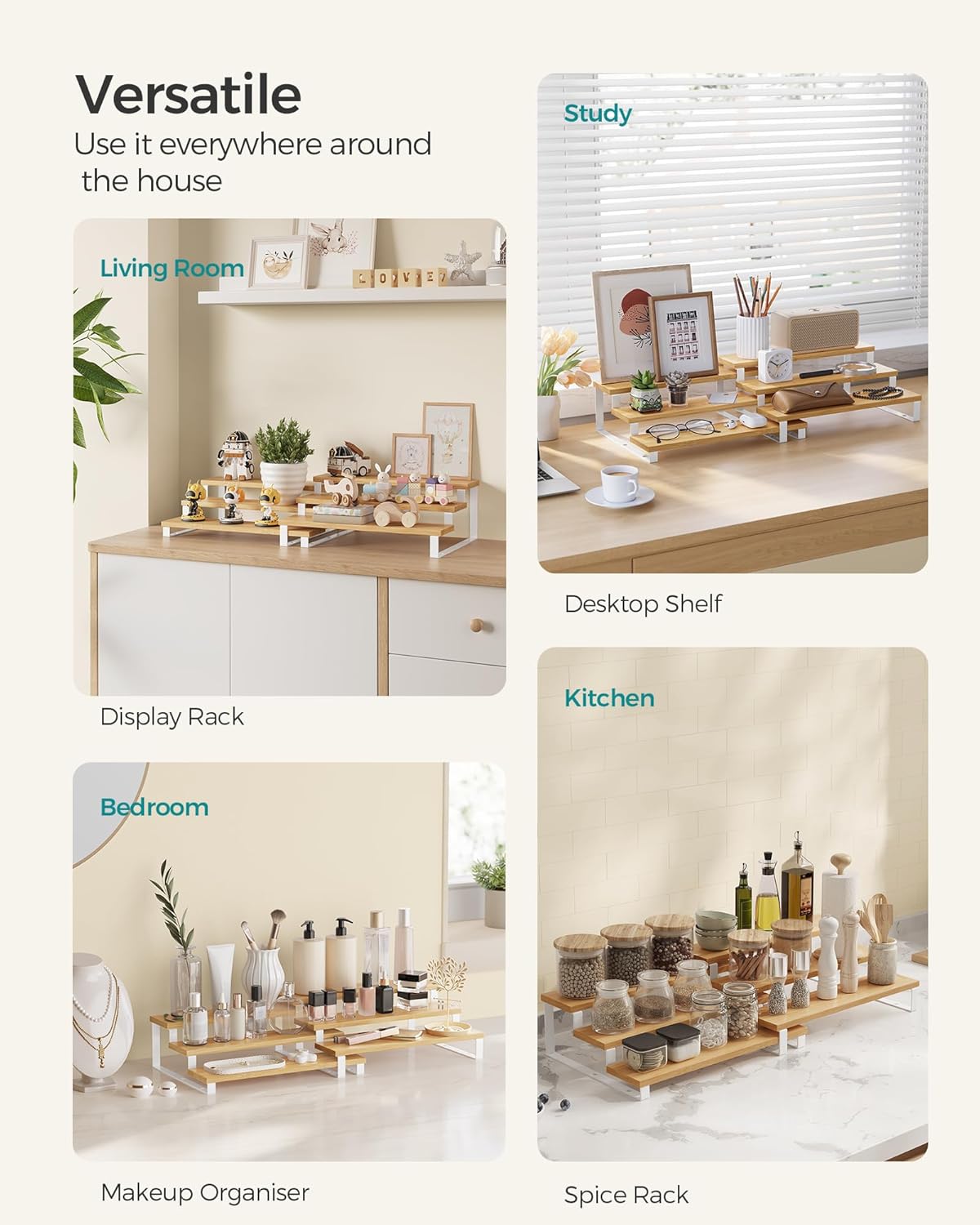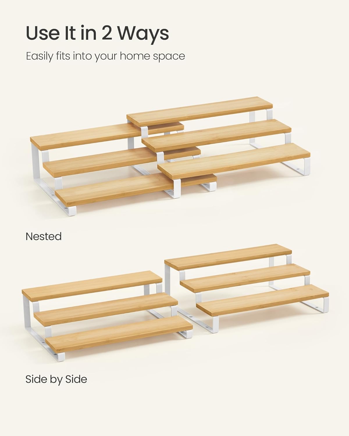 SONGMICS Raft de depozitare extensibil cu 3 nivele, bambus, stivuibil, 32x25x11cm, maro natur si alb Household NewTrend