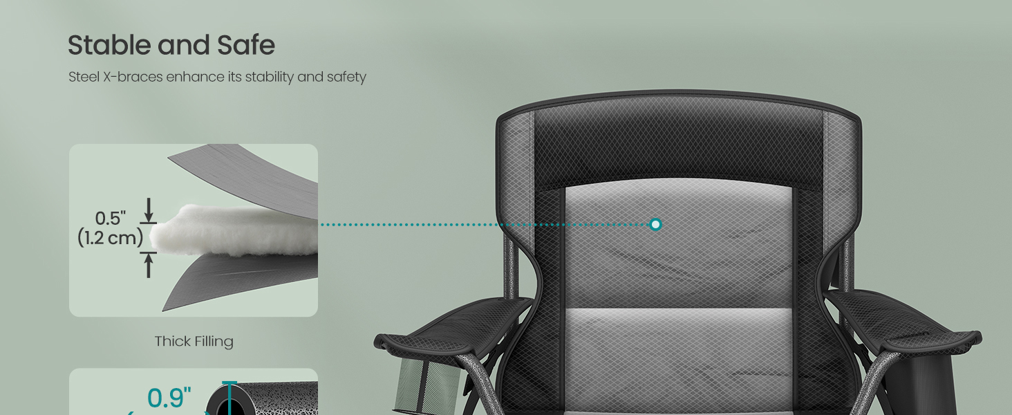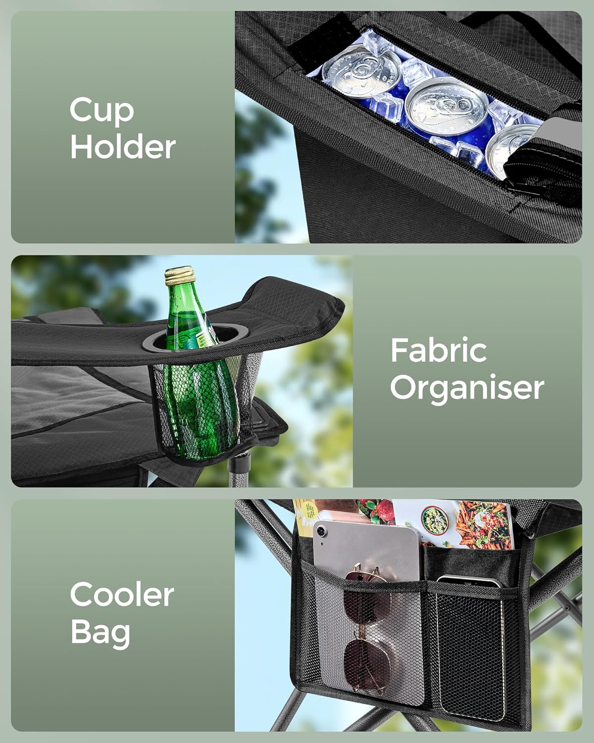 SONGMICS Scaun pliabil camping premium cu spatar inalt si sezut buretat, suport bauturi si buzunar termo, 200 kg, 63x95x100 cm, negru Household NewTrend