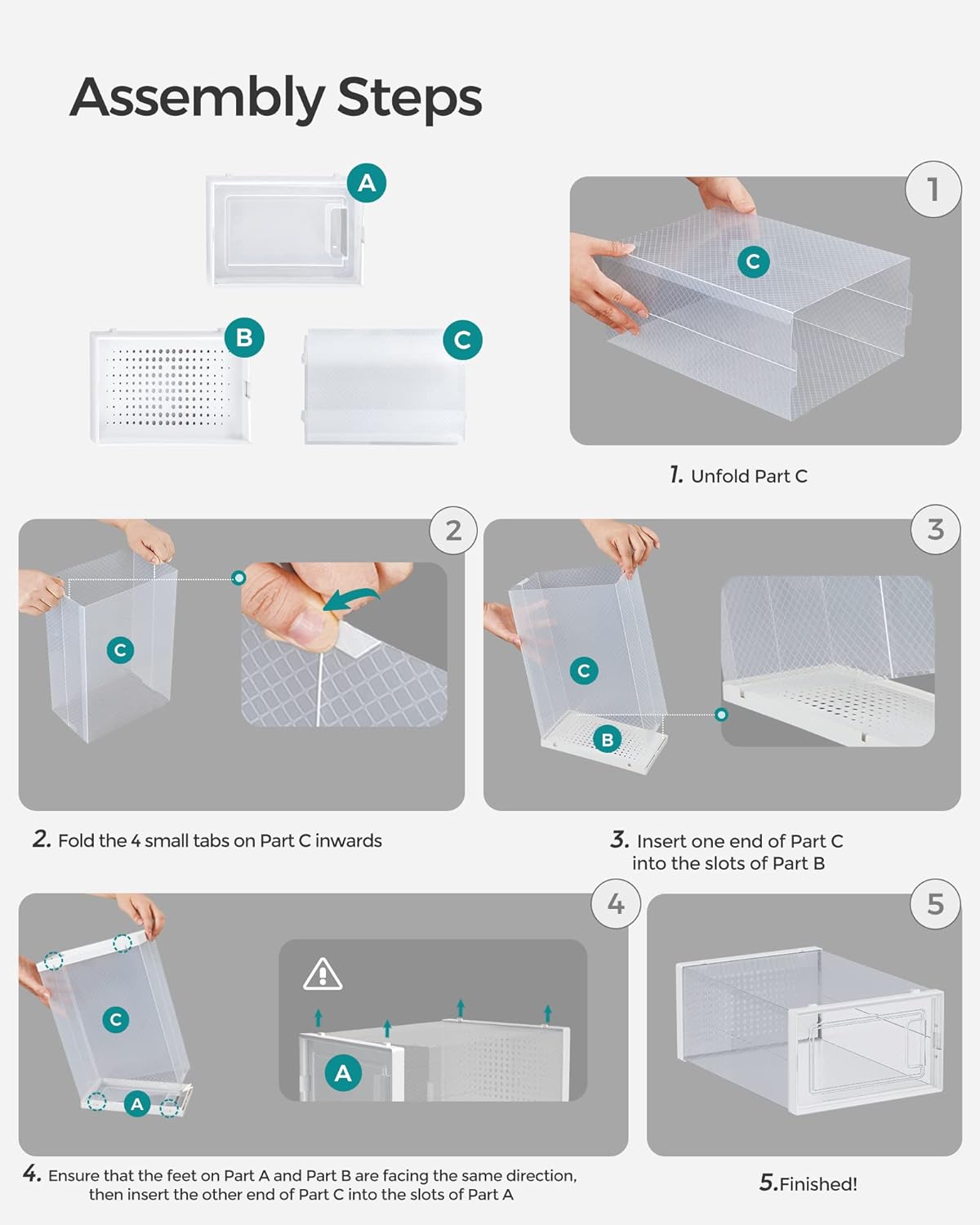 Mod de utilizare: asambleaza fiecare cutie prin fixarea partii frontale, spatelui si corpului, apoi stivuieste-le in functie de spatiul disponibil. Introdu pantofii in interior si foloseste usa frontala pentru acces rapid. Sunt potrivite pentru organizarea zilnica a incaltamintei in locuinta.
