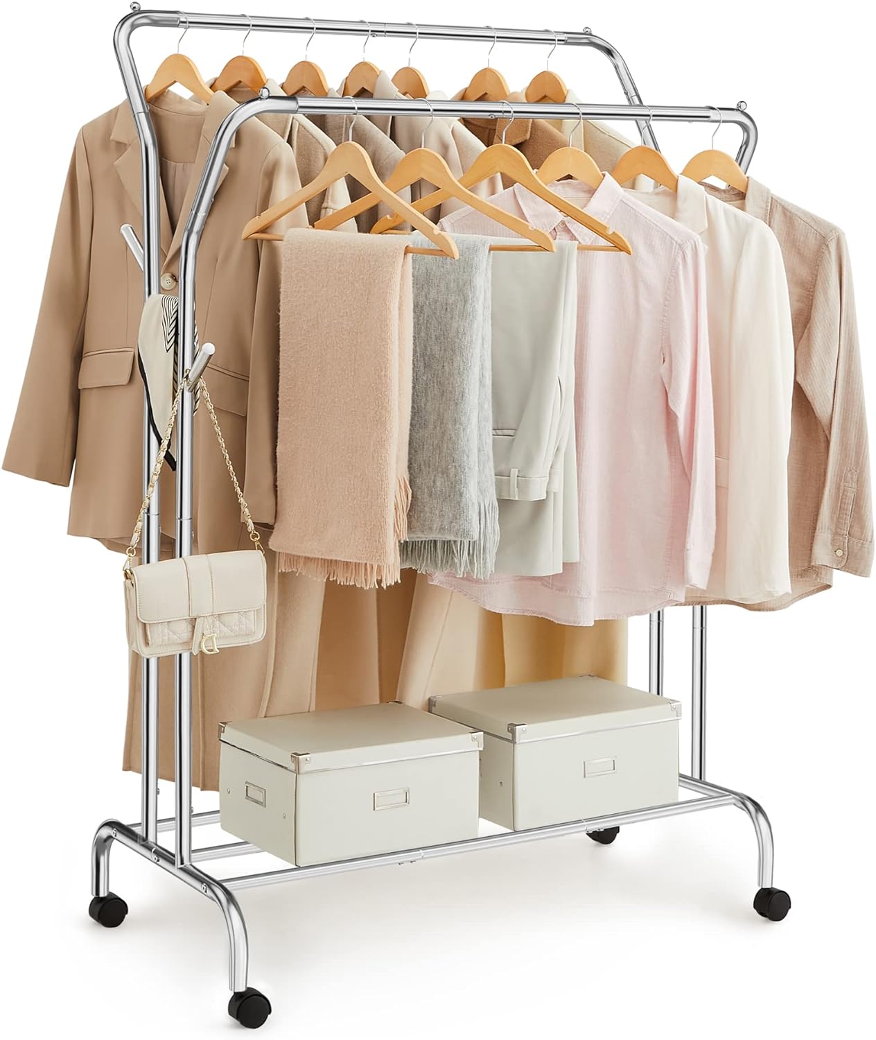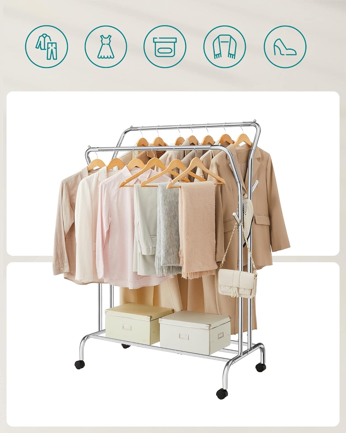 SONGMICS Suport pentru haine pe roti, cu polita, sina dubla, cadru metalic, sarcina 100kg, 53x104x155cm, inox argintiu Household NewTrend