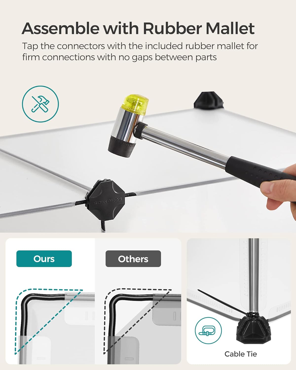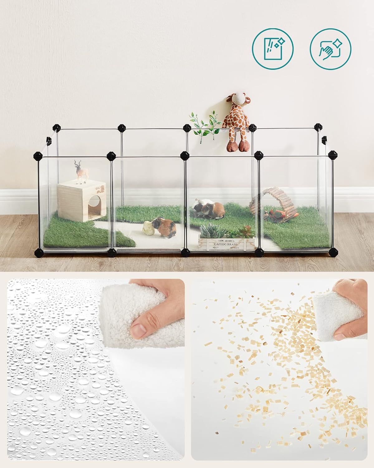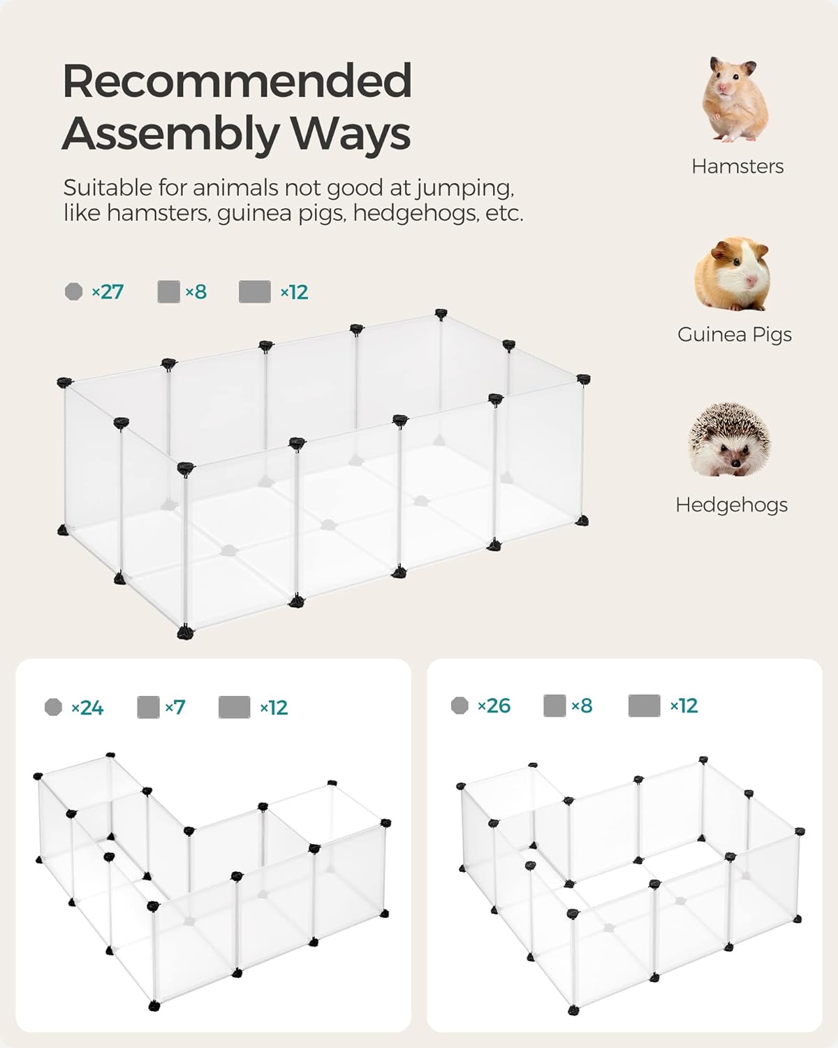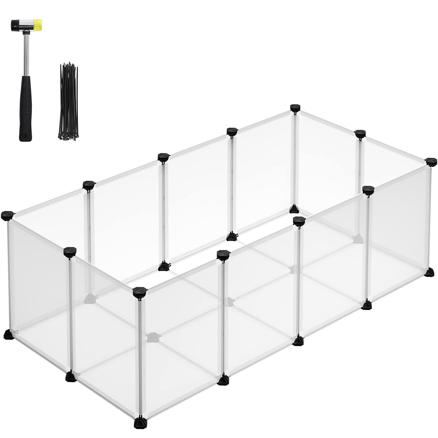 Specificatii: - Culoare: Alb transparent- Material: Panou din plastic PP, Conector din plastic ABS- Dimensiunea produsului: 125 x 63 x 42 cm (L x l x i)- Greutatea produsului: 3,5 kgContinutul pachetului:- 12 x panou din plastic (40 x 30 cm)- 8 x panou din plastic (30 x 30 cm)- 27 x Conector din plastic- 30 x Legatura pentru cablu- 1 x Ciocan- 1 x Instructiuni Note SONGMICS: - Pentru a impiedica animalele de companie sa mestece sau sa muste, instalati panourile din plastic cu partile laterale care prezinta cusaturile orientate in jos sau spre exterior.- Pentru a preveni scurgerea excrementelor sau resturilor animalelor de companie si murdarirea podelei, va recomandam sa plasati un covoras pentru pipi la baza incintei in timpul utilizarii.- In ciuda designului cu colturi fara goluri, se sugereaza adaugarea unui covoras in jurul bazei si acoperirea articulatiilor pentru a nu lasa nicio sansa de scapare pentru mestecatorii avizi.- Tarcul este destinat doar animalelor de companie mici, nu este recomandata pentru animale mai mari, cum ar fi caini sau pisici adulte.- In timpul asamblarii, va rugam sa va asigurati ca colturile panourilor sunt introduse in partea de jos a conectorilor in intregime pentru a adauga siguranta.- Conectati doua panouri la structura unul langa altul cu 2 legaturi de cablu. Va rugam sa nu o utilizati in aer liber pentru perioade lungi de timp. Asamblarea este floare la ureche Pur si simplu uniti panourile din plastic cu conectorii cu unghiuri multiple cu ajutorul ciocanului de cauciuc inclus, veti monta rapid acest loc de joaca pentru animale de companie. Structura modulara si usoara il face, de asemenea, usor de dezasamblat sau de mutat Spatios si sigur Acest tarc pentru animale de companie ofera o zona spatioasa pentru ca porcusorii de Guineea, hamsterii, aricii sau iepurasii sa alerge, sa exploreze si sa se distreze. Panourile netede de 40 x 30 cm si 30 x 30 cm le ofera putine sanse de a se catara afara Detalii preventive Podeaua acestei custi pentru hamsteri nu numai ca sporeste stabilitatea, dar ofera si o protectie eficienta pentru podeaua dvs. Panourile din plastic si conectorii sunt conectati ferm pentru a impiedica animalele mici sa sape pentru a iesi Personalizabil si extensibil In limita pieselor incluse, aceasta cusca pentru animale de companie poate fi configurata in forma de L pentru colturi sau stivuita intr-o casa cu 2 etaje. Pentru mai multe detalii, va rugam sa consultati modalitatile noastre de asamblare recomandate in fotografii Translucid si usor de curatat Panourile din plastic translucid va permit sa supravegheati si sa interactionati cu micii dvs. prieteni blanosi. Cand tarcul se murdareste, pur si simplu stergeti cu o carpa umeda