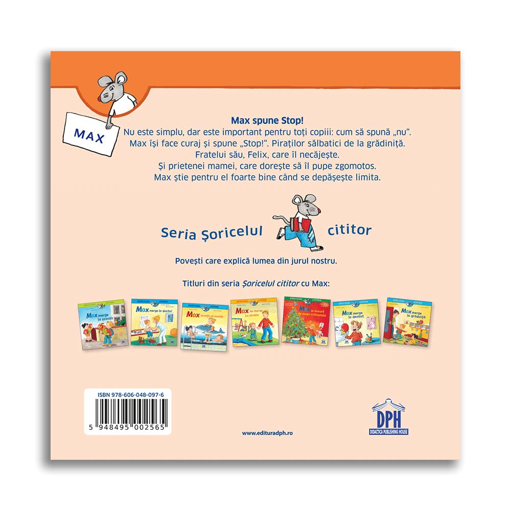 Soricelul cititor: Max spune Stop! este o carte pentru copii 3+ care ii ajuta pe cei mici sa inteleaga, intr-un mod bland si usor de urmarit, cat de important este sa isi exprime limitele personale. Prin povestea lui Max, copiii invata ca este in regula sa spuna „stop” atunci cand se simt inconfortabil, fie la gradinita, acasa sau in alte situatii de zi cu zi.