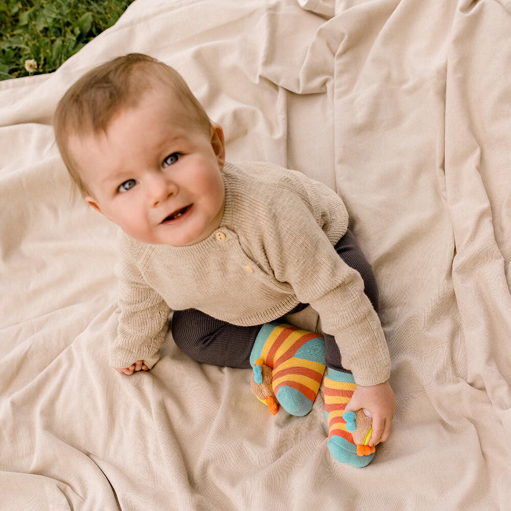 Mod de utilizare: se pun ușor în picioarele bebelușului, iar în timpul mișcărilor naturale acestea scot sunete delicate de zornăit, transformând joaca într-un exercițiu de explorare și descoperire.