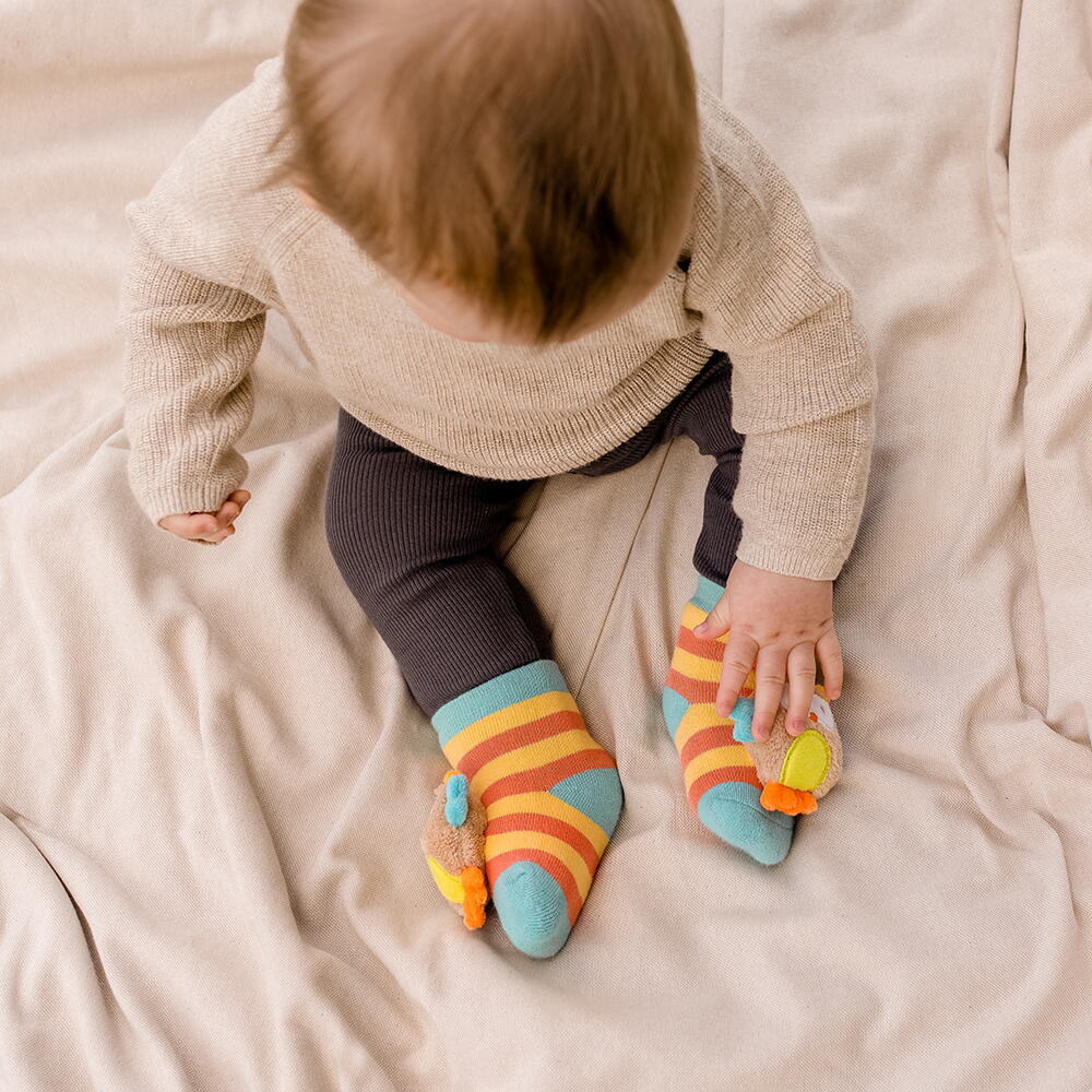 Aceste șosete educative pentru bebeluși susțin dezvoltarea coordonării motorii, atrag atenția prin aspectul prietenos și sunt ideale pentru joacă acasă sau în deplasare. Sunt potrivite încă din primele luni și oferă o combinație reușită între confort, joacă și stimulare senzorială.
