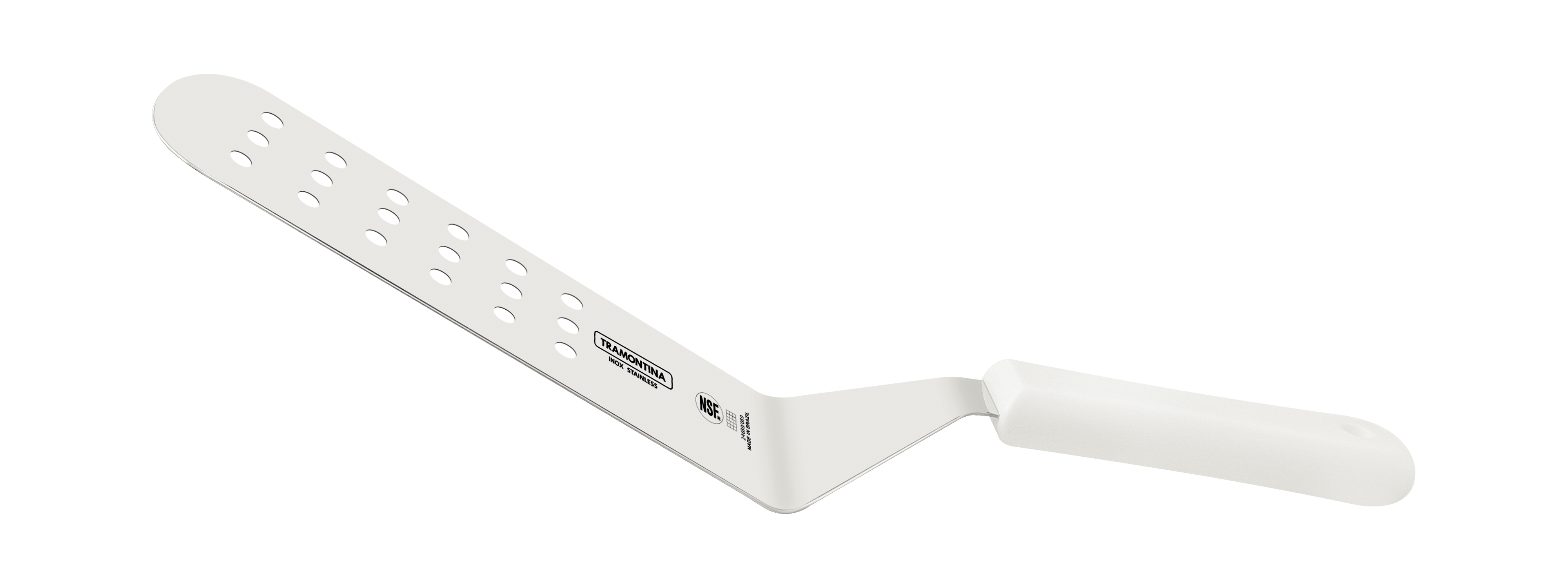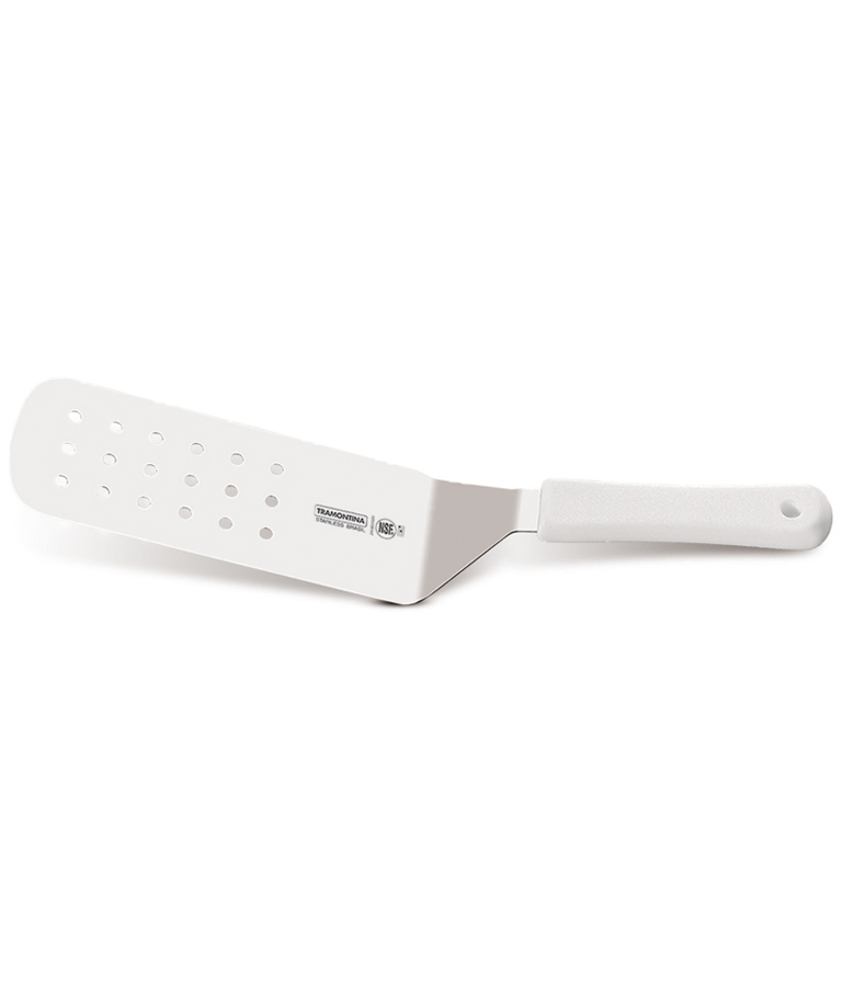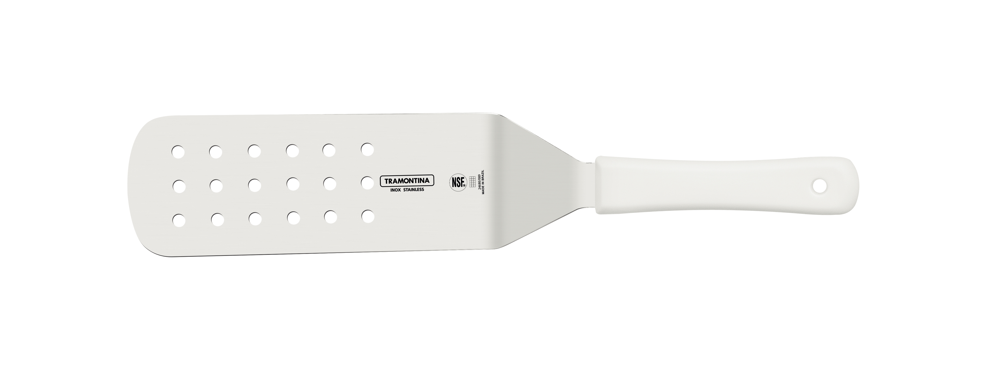 Spatula perforata dreptunghiulara gama PROFISSIONAL MASTER, inox de foarte buna calitate, dimensiune lama 228x76 mm, maner culoare alba din polipropilena cu protectie antimicrobiana Microban®, produs cu certificare NSF U.S.A., lungime totala 105mm