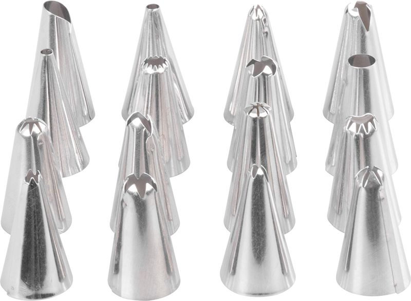 Zdobiace špičky sú určené do bavlnených, plastových alebo jednorázových igelitových vrecúšok. Skvele sa hodia na zdobenie krémov, zmrzliny, peny či krémového pečiva. Sú vhodné do umývačky riadu. V balení nájdete 16 ks špičiek s rôznymi vzormi zdobenia. Vyrobené z nerezu.