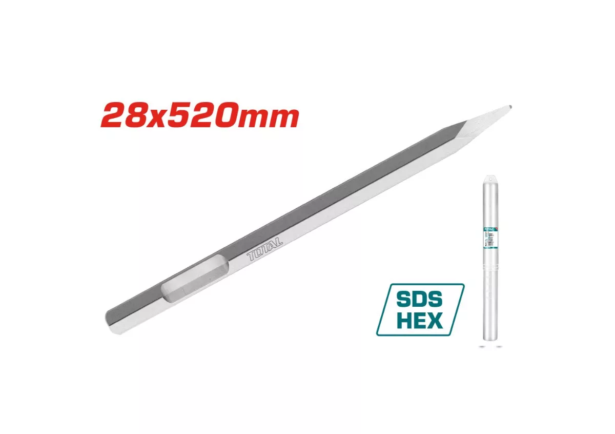 Spitul dalta TOTAL 28x520 mm cu prindere SDS Hex este alegerea potrivita pentru lucrari solicitante de daltuire si demolare, atunci cand ai nevoie de forta, control si rezistenta in timp. Varful ascutit ajuta la patrunderea rapida in material si la indepartarea eficienta a betonului, zidarie sau tencuieli.