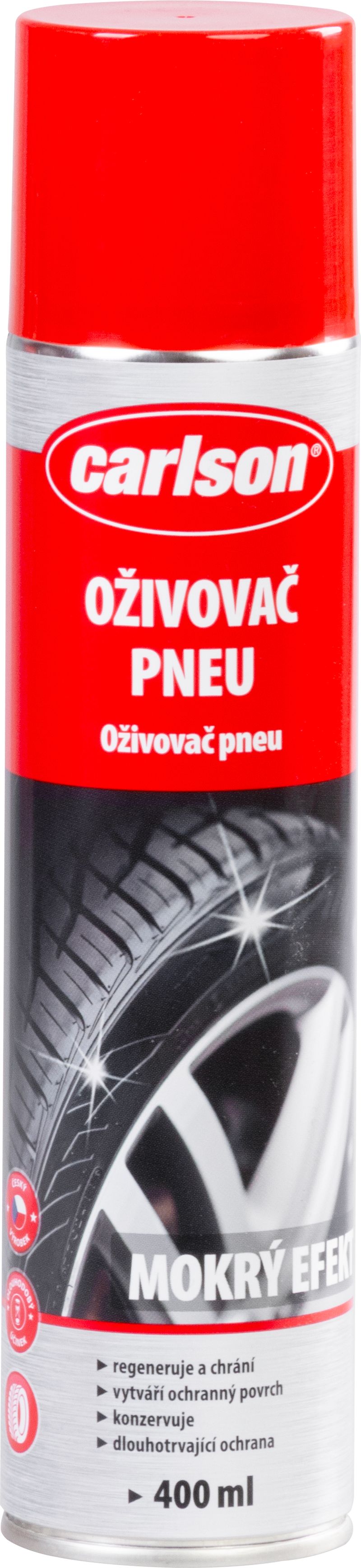 Spray-ul Carlson pentru anvelope este un revitalizant de anvelope tip aerosol, creat pentru regenerare și protecție. Pătrunde în cauciuc, ajută la protejarea împotriva îmbătrânirii și crăpării, se usucă rapid și lasă un efect de luciu (wet look) care evidențiază aspectul îngrijit al mașinii.