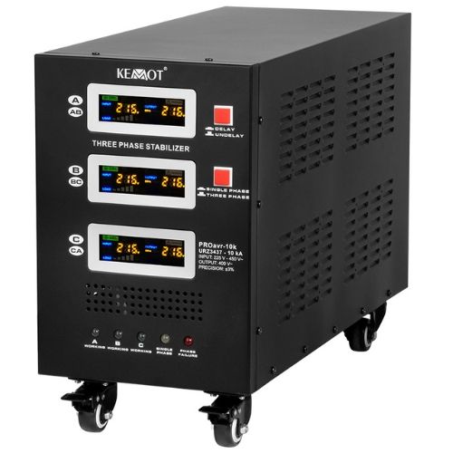Stabilizatorul de tensiune trifazat KEMOT PROavr-10k 10 kVA este solutia potrivita pentru protejarea echipamentelor sensibile impotriva fluctuatiilor din reteaua electrica. Cu tehnologie pe servomotor, tensiune stabilizata la 230 V ±3%, functii BYPASS si DELAY, acest model este recomandat atat pentru uz rezidential, cat si pentru aplicatii profesionale.