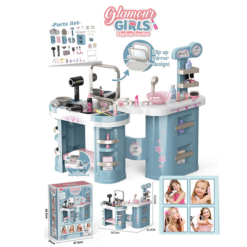 Transforma orice camera intr-un salon de infrumusetare plin de stil cu statia de coafat Glamour Girls, un set de joaca complet, creat special pentru micii stilisti pasionati de frumusete si jocuri de rol. Cu un design modern in nuante elegante de albastru si roz, aceasta statie ofera o experienta de joaca captivanta, realista si bine organizata.