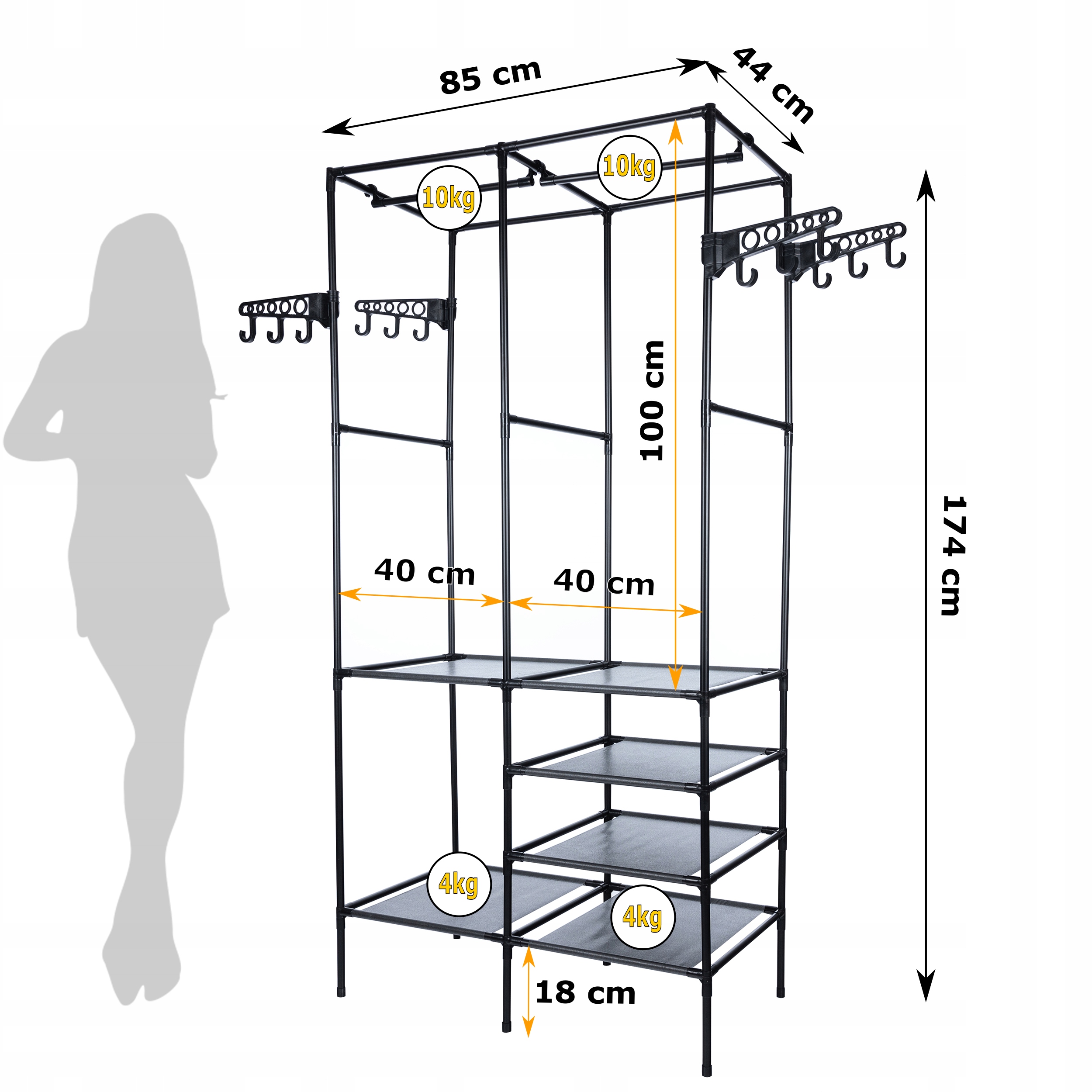 Stand de haine cu 6 polite si 2 bare pentru umerase, 85x44x174 cm, negru