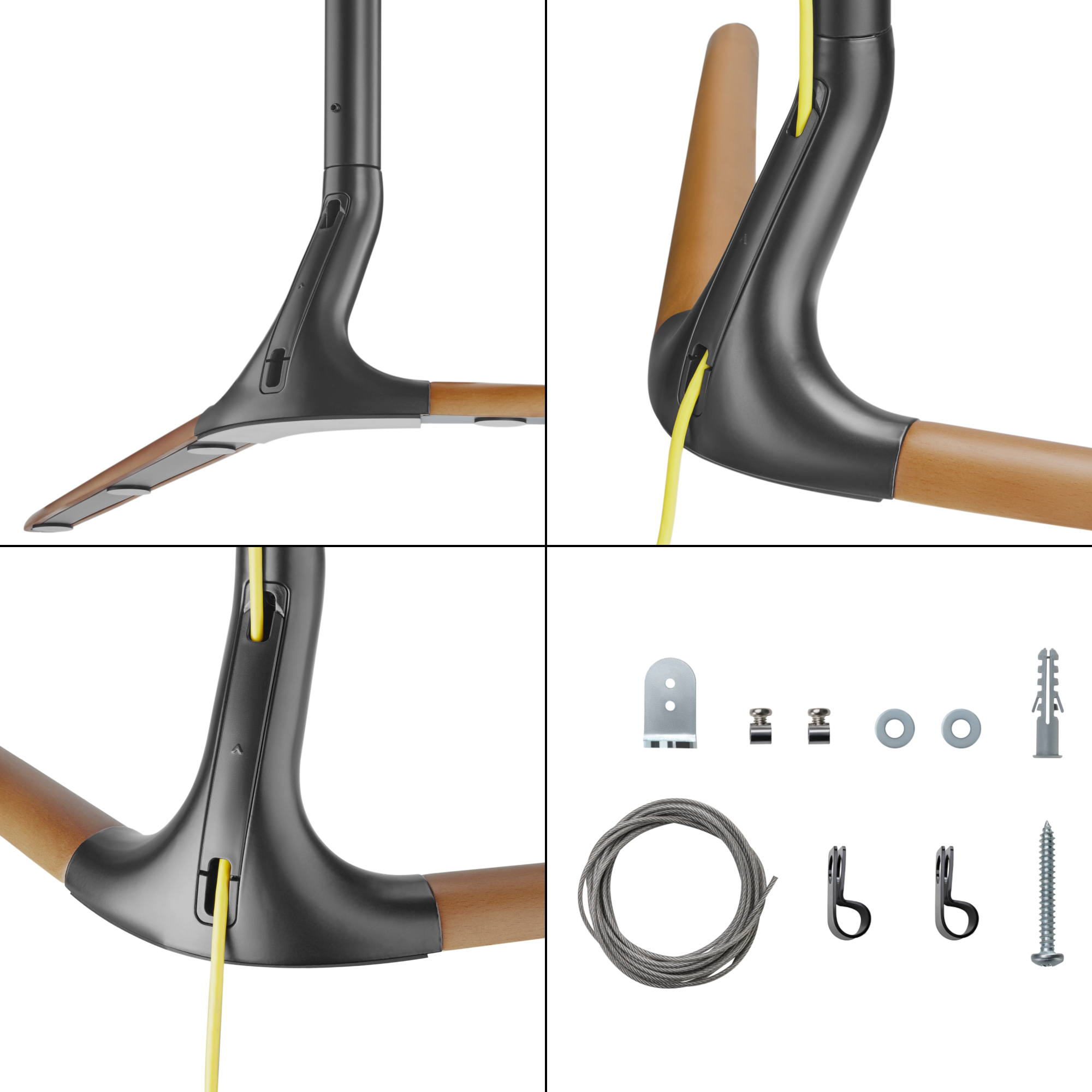 Un mare avantaj este sistemul de ghidare integrata a cablurilor, care ajuta la pastrarea unui aspect ordonat si curat. Pentru un plus de siguranta, standul poate fi utilizat si cu fir de siguranta pentru fixare suplimentara, fiind o optiune inspirata in locuintele cu copii sau animale de companie.