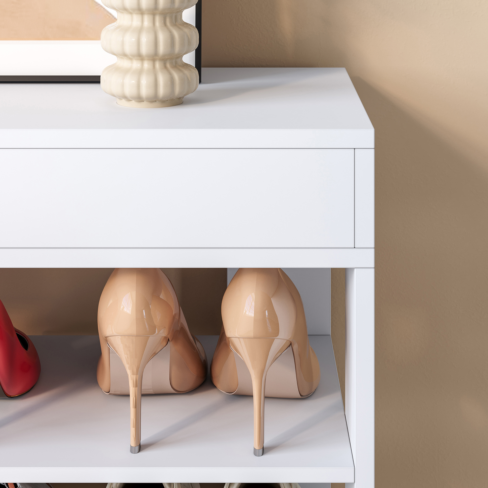 Fünf großzügige Ablageflächen bieten ausreichend Stauraum für verschiedene Schuharten, wie Sneaker, Sandalen und Hausschuhe. Ergänzend dazu bietet die integrierte Schublade praktischen Platz für Accessoires, Schlüssel oder andere Kleinteile, während die obere Ablagefläche ideal für Dekorationen, Pflanzen oder Bilder geeignet ist.