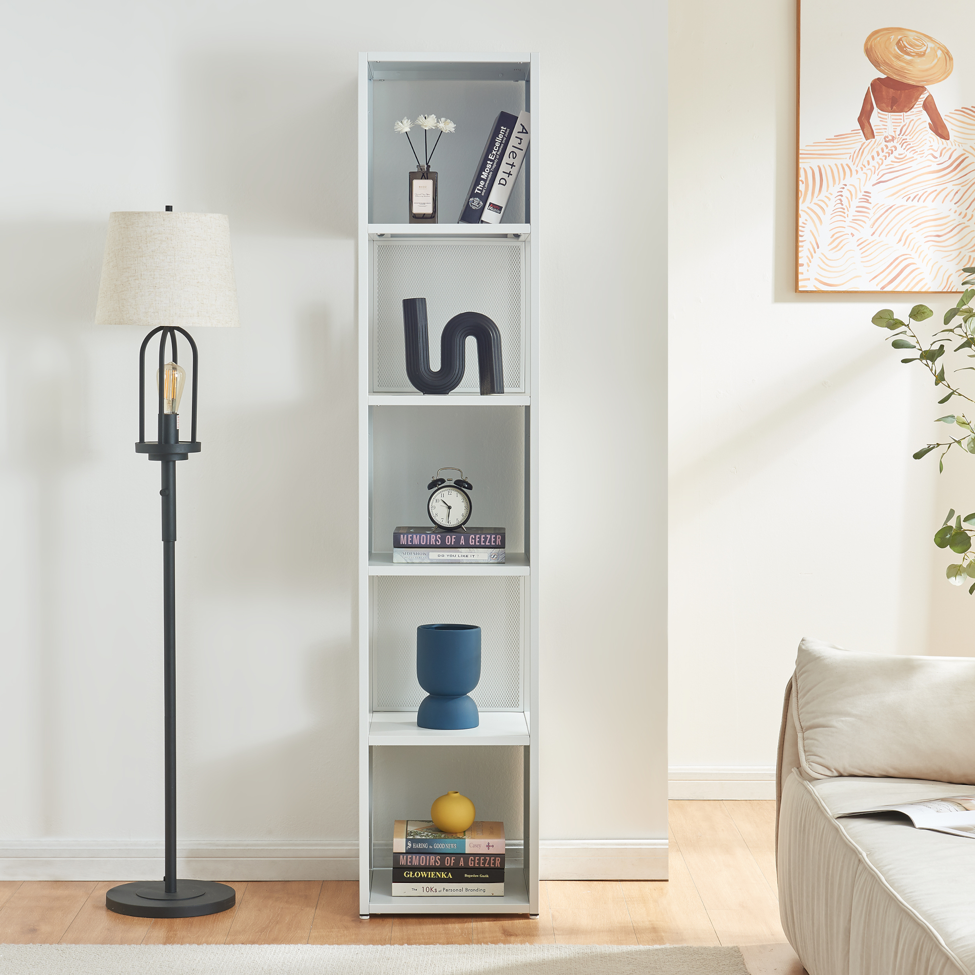 Die fünf Ablagen des Standregals bieten ausreichend Platz zum Verstauen von Büchern, Deko, Pflanzen und anderen persönlichen Schätzen. Durch die offene Gestaltung sind Ihre Lieblingsgegenstände stets griffbereit und gleichzeitig ansprechend präsentiert.