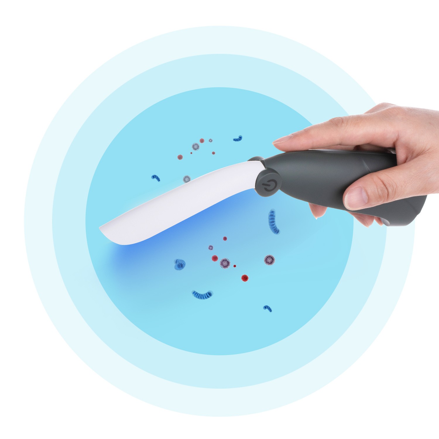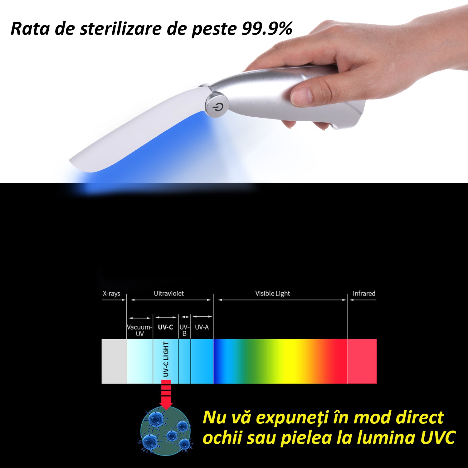 Cum se foloseste: deschide dispozitivul, porneste-l si tine lumina orientata spre suprafata de dezinfectat, la aproximativ 6 cm, timp de circa 20 de secunde. Repeta pe zonele dorite. Evita expunerea directa a pielii si a ochilor la lumina UV-C.