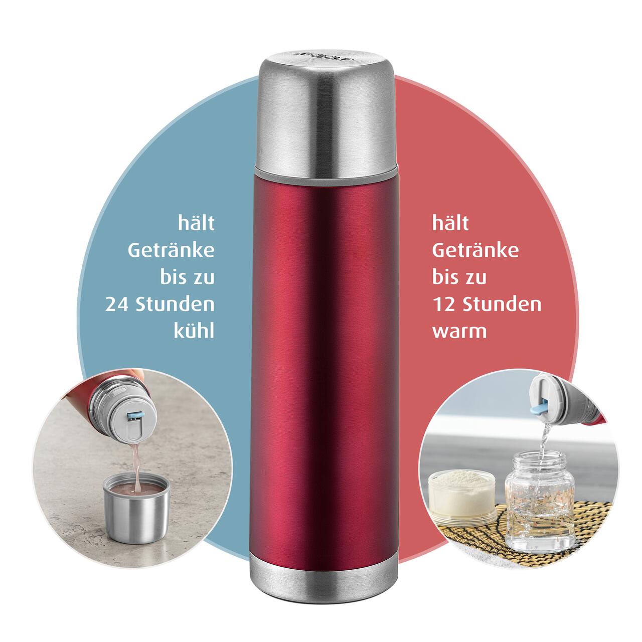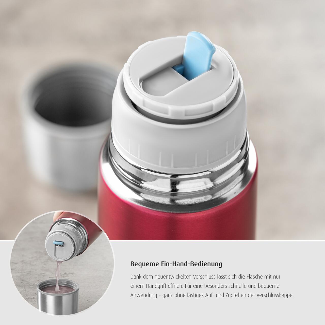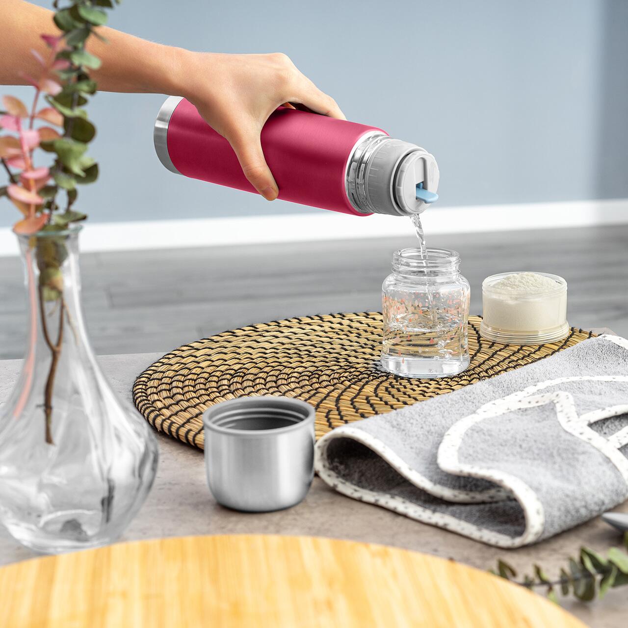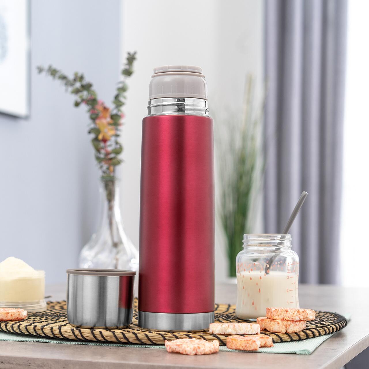 Designul robust si finisajul rosu modern se combina cu o utilizare confortabila: exteriorul ramane placut la atingere chiar si cand termosul contine lichide fierbinti, iar dopul etans cu garnitura din silicon ajuta la prevenirea scurgerilor. Deschiderea larga permite umplerea si curatarea usoara, iar capacul poate fi folosit si ca o cana practica.