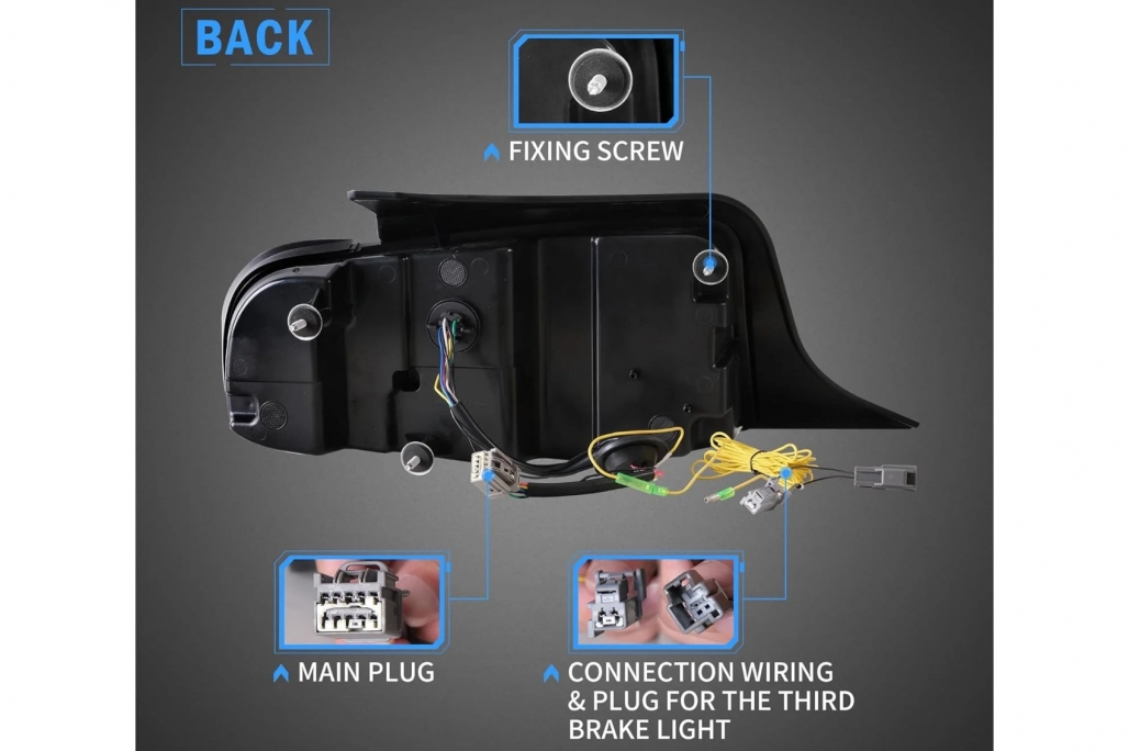 Stopuri LED Culoare: Fumuriu Pozitie: LED Frana: LED Marsarier: LED Semnalizare: LED dinamic secvential / static *5 moduri diferite de a configura semnalul de viraj *5 moduri diferite de a configura frana