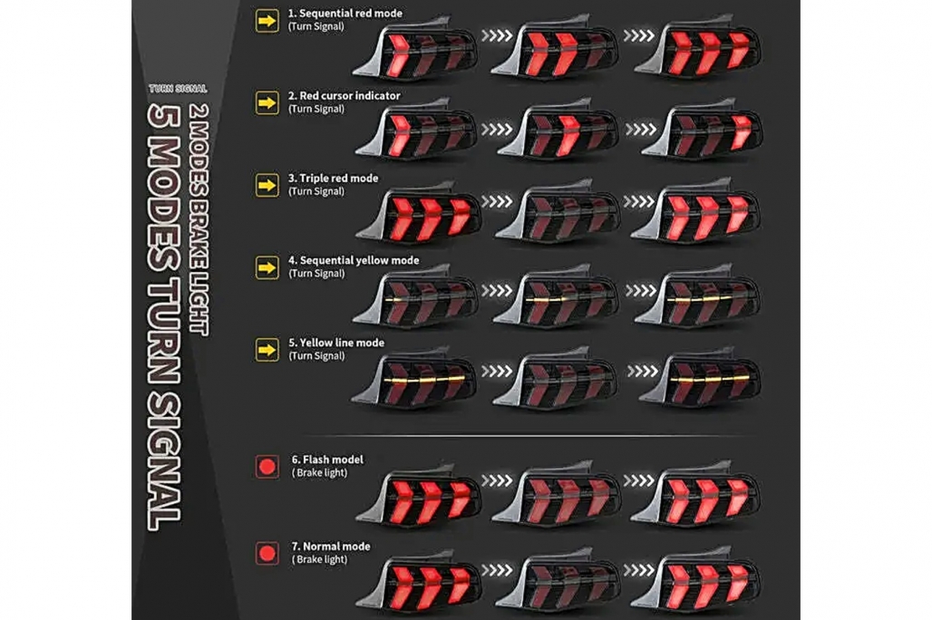 Cu aceste stopuri, puteti experimenta si alege unul dintre cele 5 moduri de afisare a semnalului si 2 moduri de a lumini de întoarcere. Bucurați-vă de cel care vă place sau comutați între ele.