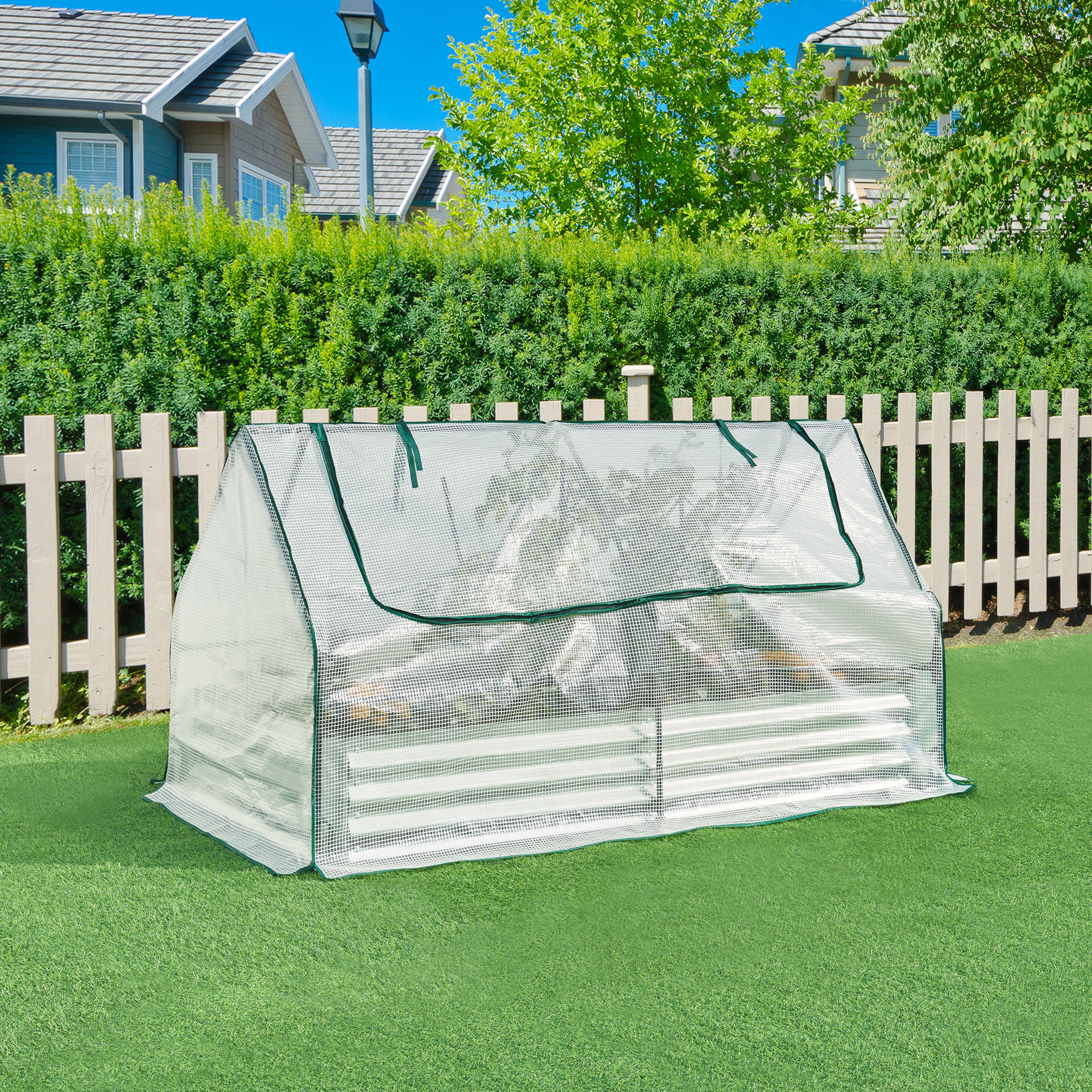 Acest strat înălțat pentru grădină este potrivit pentru cei care își doresc o creștere mai bună a plantelor, un microclimat favorabil și o utilizare comodă în curte sau grădină. Acoperișul tip fronton ajută la scurgerea apei de ploaie, iar cadrul metalic asigură stabilitate în utilizarea de zi cu zi.