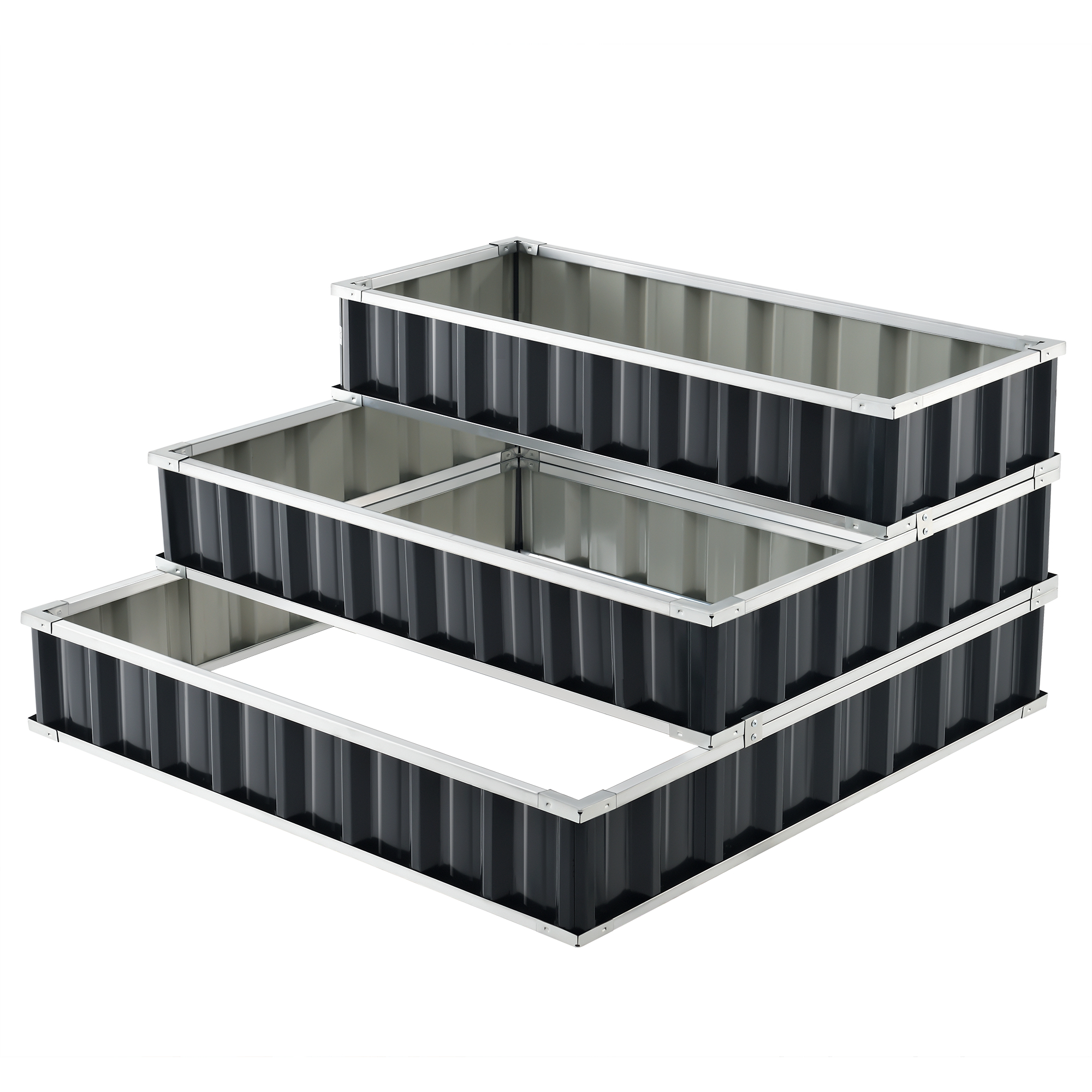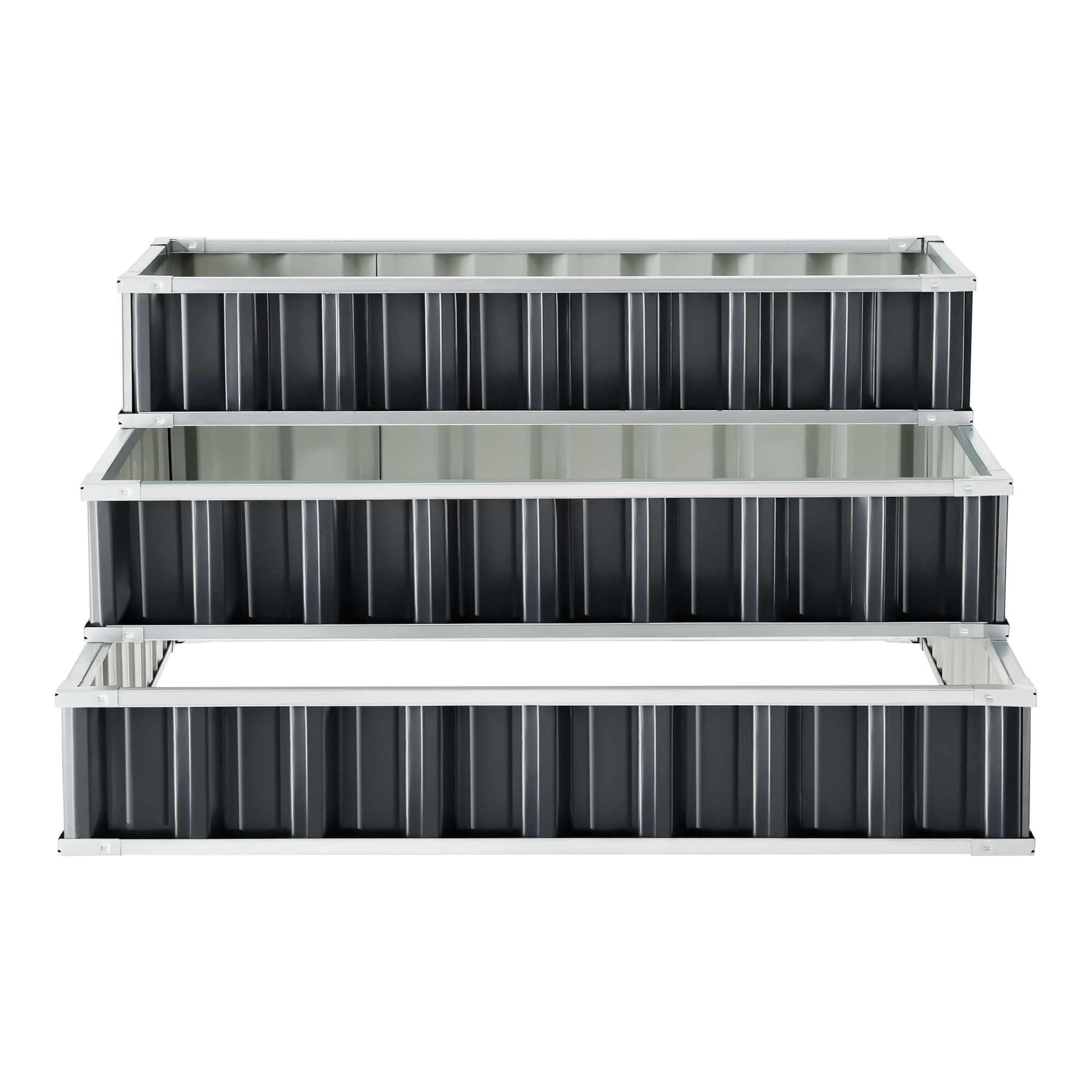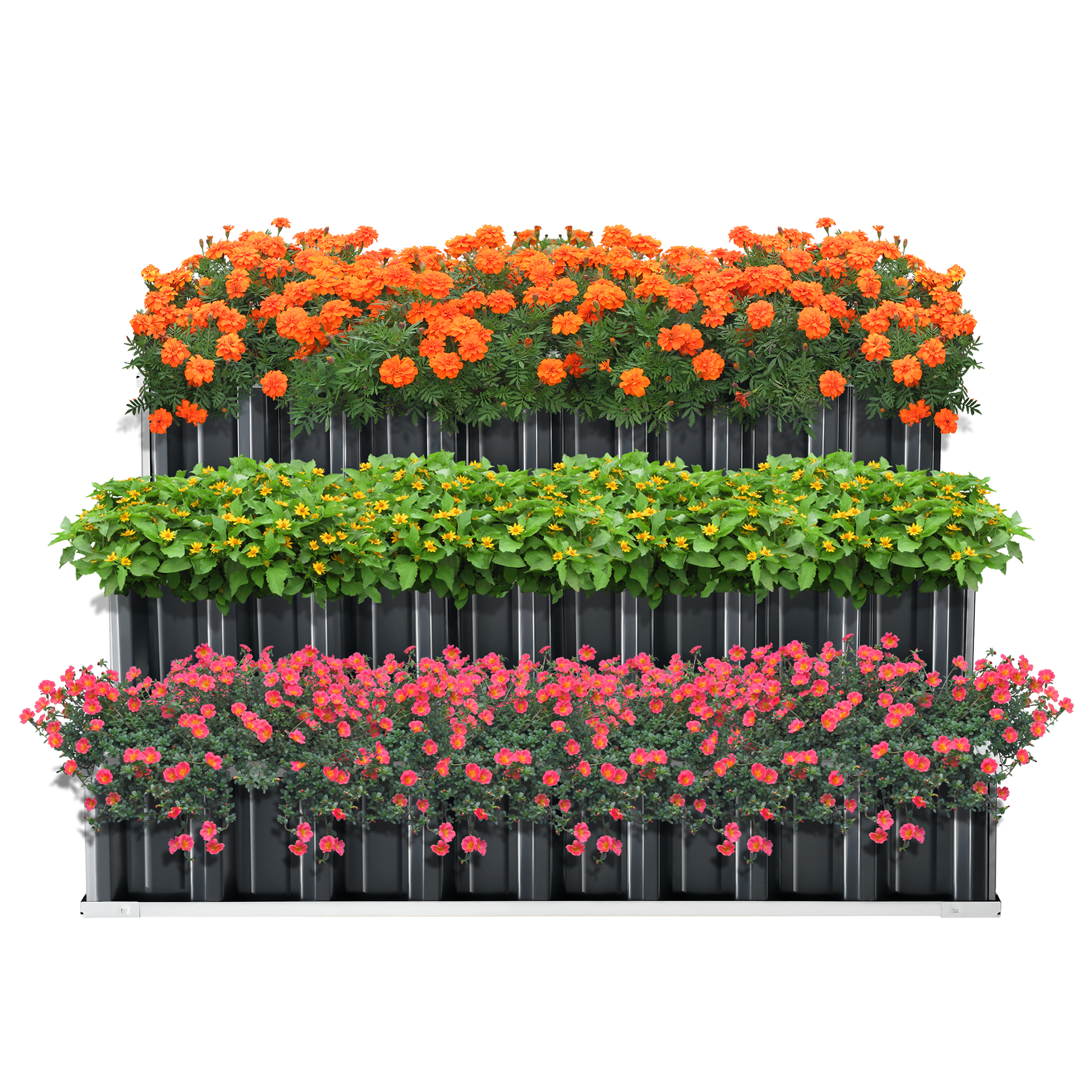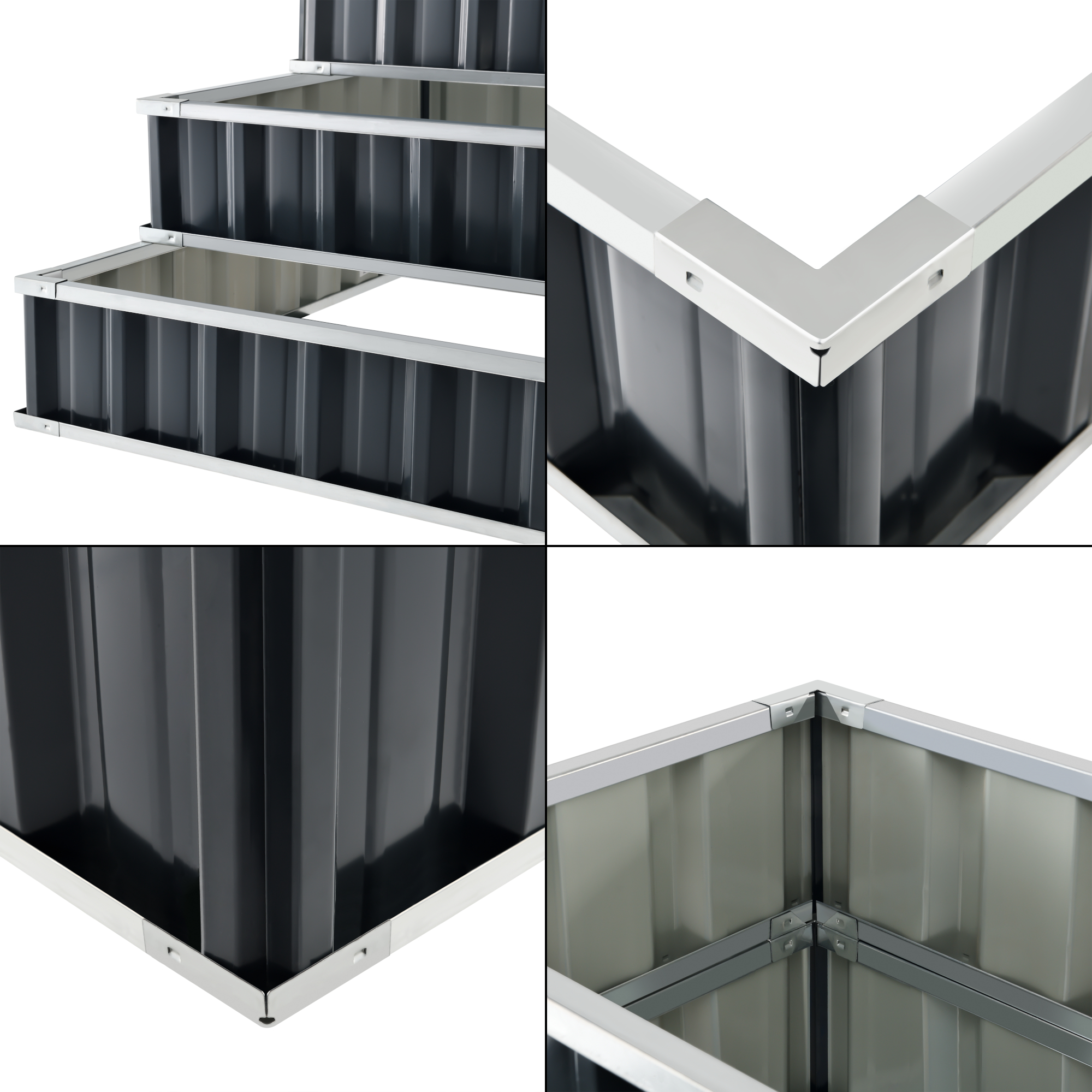 Stratul înălțat de grădină cu 3 niveluri este o soluție practică și estetică pentru organizarea plantelor în curte, grădină sau pe lângă terasă. Designul tip scară oferă o prezentare atractivă și o separare eficientă a culturilor, fiind ideal pentru flori, ierburi aromatice și legume. Construcția din oțel zincat asigură rezistență bună la intemperii și o întreținere ușoară.