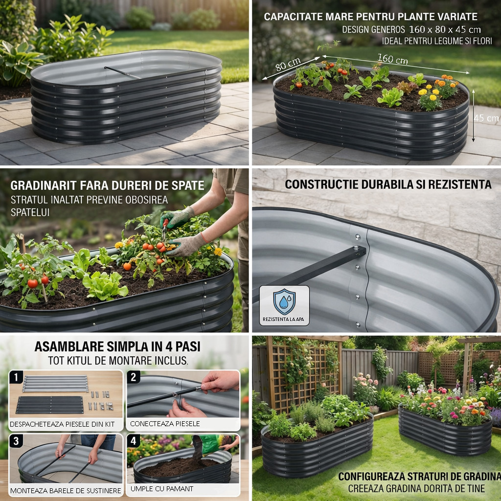 Stratul inaltat de gradina 160x80x45 cm din otel galvanizat este solutia practica pentru cultivarea organizata a legumelor, florilor sau plantelor aromatice. Ideal pentru gradinari amatori si pasionati, ofera drenaj eficient si protectie sporita a culturilor.