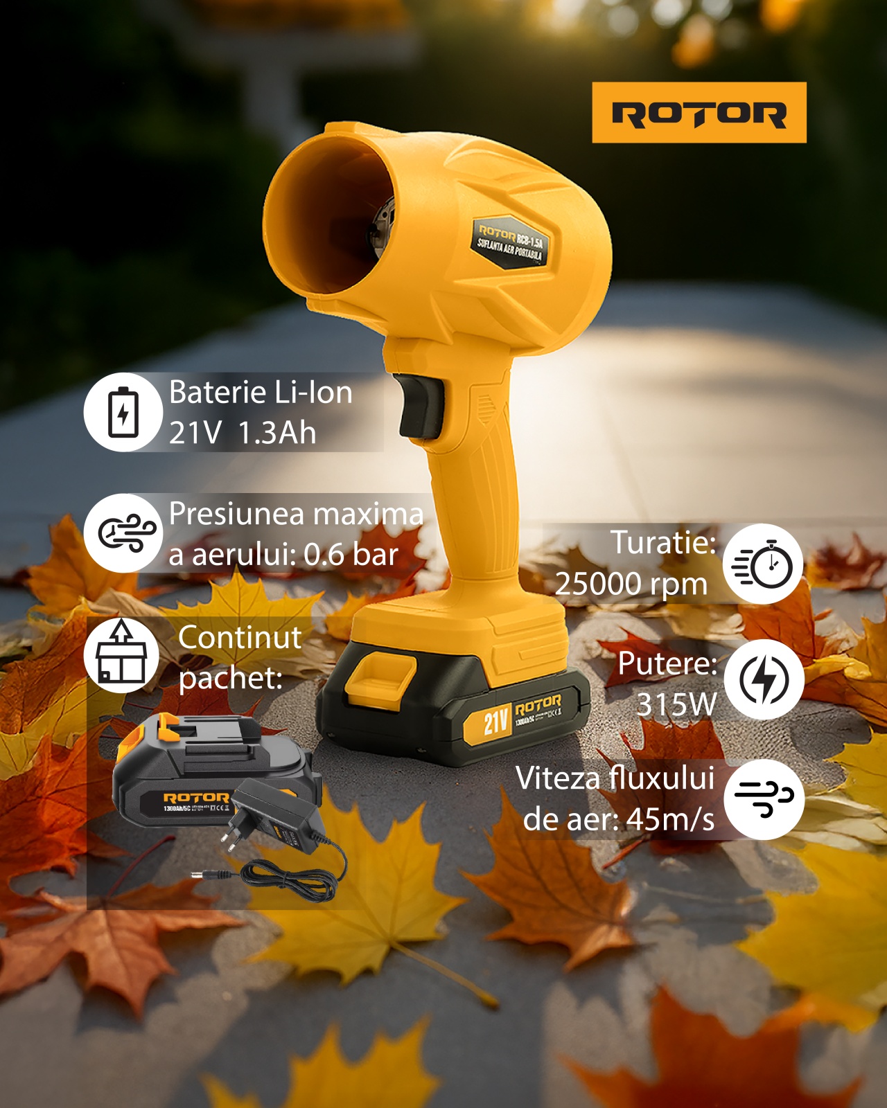 Specificatii Suflantă aer acumulator ROTOR RCB-1.5A, 21V,