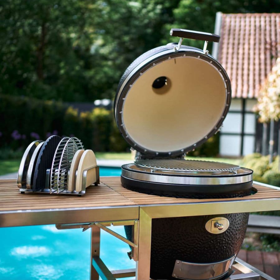 Designul întâlnește tehnologia! Cea mai recentă ediție a grătarului Kamado MONOLITH este seria Avantgarde. Anii de eforturi pentru perfecțiune în ceea ce privește calitatea și funcționaitatea au dus la dezvoltarea Avantgarde. Suportul pentru accesorii Avantgarde din oțel inoxidabil oferă suficient spațiu de depozitare și opțiuni de stocare pentru grille, piatră deflectoare și alte accesorii. Depozitați-vă accesoriile ușor și bine organizat. Accesoriile și decorațiunile ilustrate nu fac parte pachetul ce include acest produs.Caracteristici: