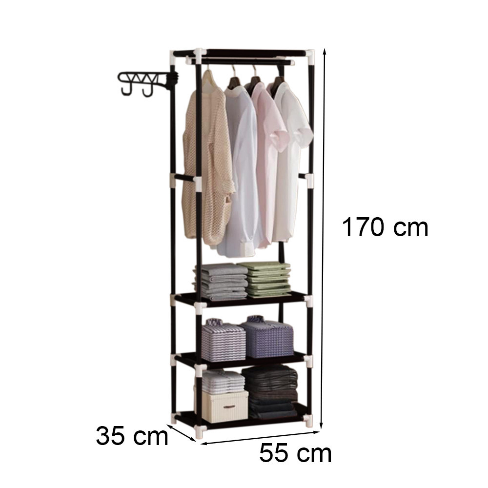 Designul pe 3 niveluri iti ofera spatiu separat pentru pantofi, cutii, genti sau prosoape, iar bara pentru umerase te ajuta sa pastrezi camasile si jachetele fara cute. Culoarea neagra se potriveste usor in decoruri moderne, minimaliste sau clasice.
