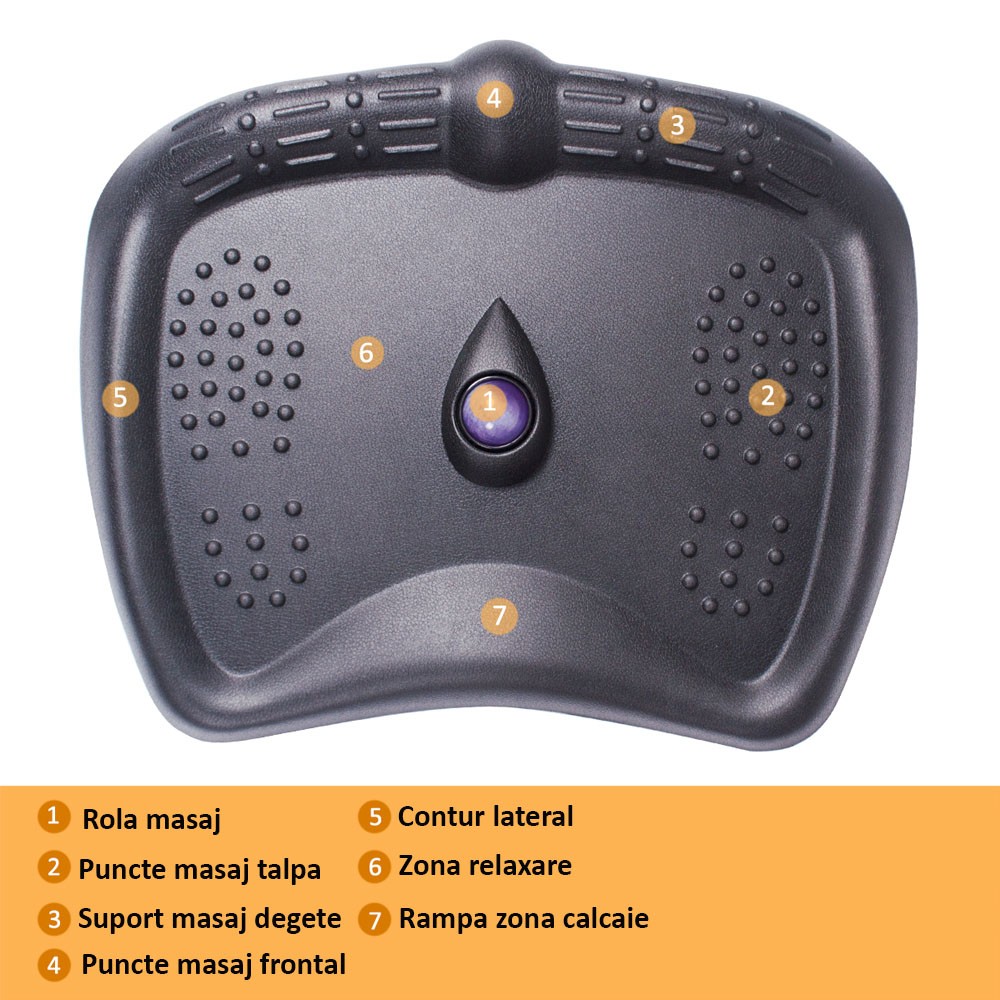 Astfel aveti la alegere 3 zone bine delimitate care au inserate elemente de masaj pentru a spori confortul si a va asigura relaxarea picioarelor si a intregului organism pe durata orelor petrecute static, la birou. Fie alegeti masajul cu rola centrala, sau cel destinat intregii talpi prin punctele de presiune dispuse sub aceasta forma, ori le folositi pe cele pozitionate pe marginea anterioara, veti obtine o stare de bine si o relaxare benefica pentru intregul organism.