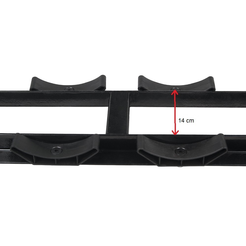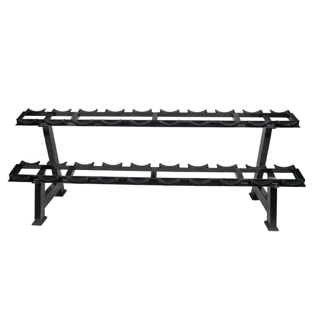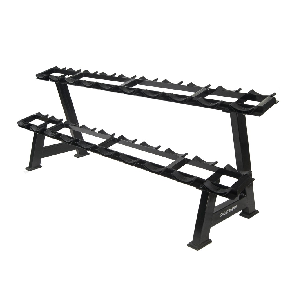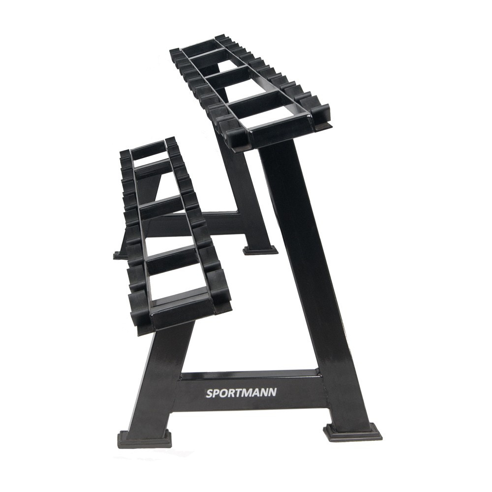 Suportul de gantere SPORTMANN cu doua rafturi este conceput pentru a depozita ganterele cu un singur maner. Cadrul robust si durabil cu rafturi inclinate cu suporti pentru gantere cu o lungime de 15 cm o latime de 22 cm si o distanta intre suporti de 7 cm va permite sa depozitati gantere de diverse dimensiuni in siguranta. Rafturile sunt concepute pentru a face depozitarea si manevrarea ganterelor cat mai usoara si confortabila. Cu o limita maxima de incarcare de 500 kg Suportul de gantere SPORTMANN este recomandat pentru sali de sport acasa, hoteliere sau de fitness.