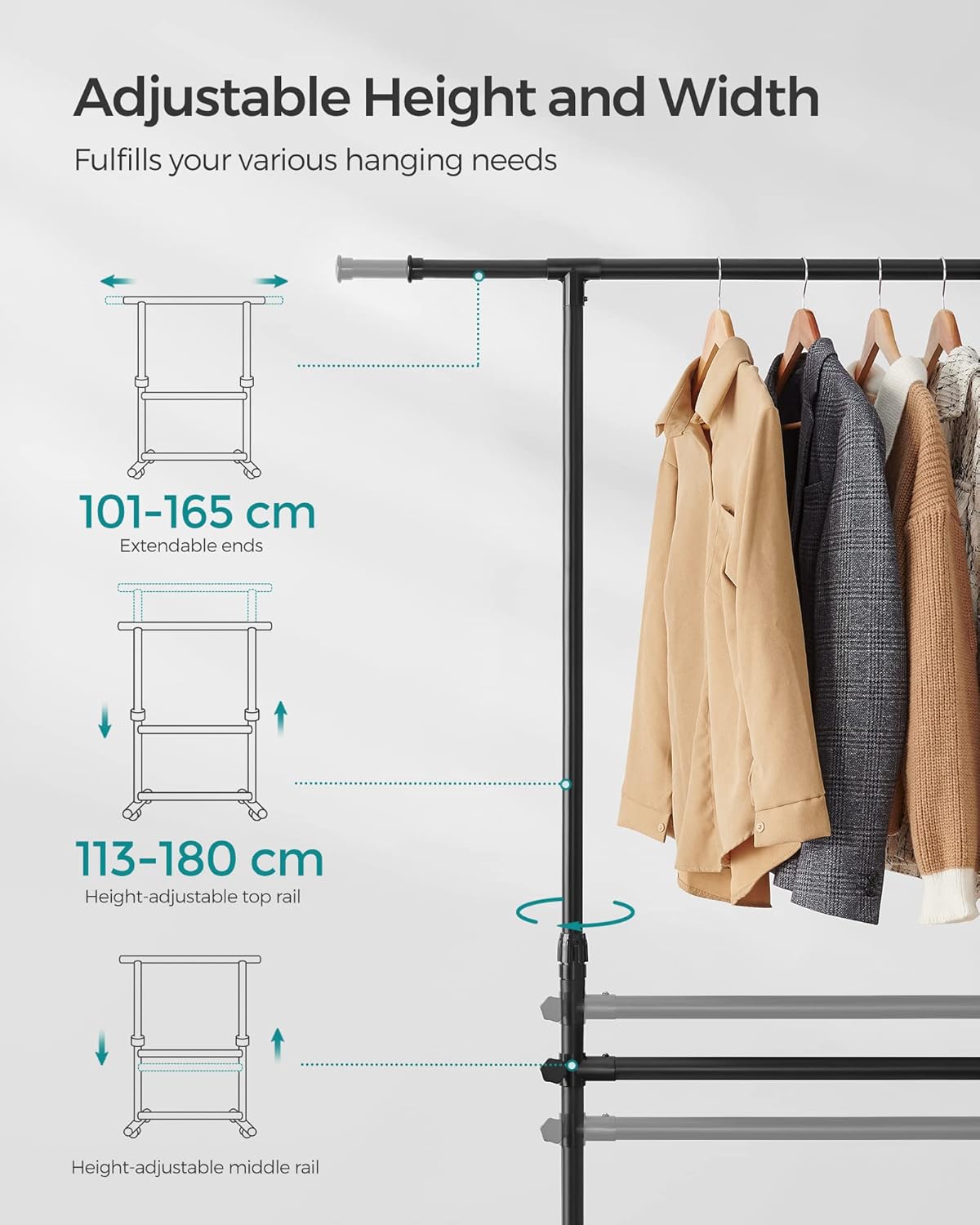 Alege un suport haine dublu practic si rezistent pentru o organizare mai buna a garderobei. Modelul SONGMICS este ideal pentru dormitor, dressing, hol sau spatii comerciale, oferind suficient loc pentru haine scurte si lungi. Datorita designului cu inaltime reglabila si bare multiple, poti pastra articolele bine aerisite si usor de accesat.