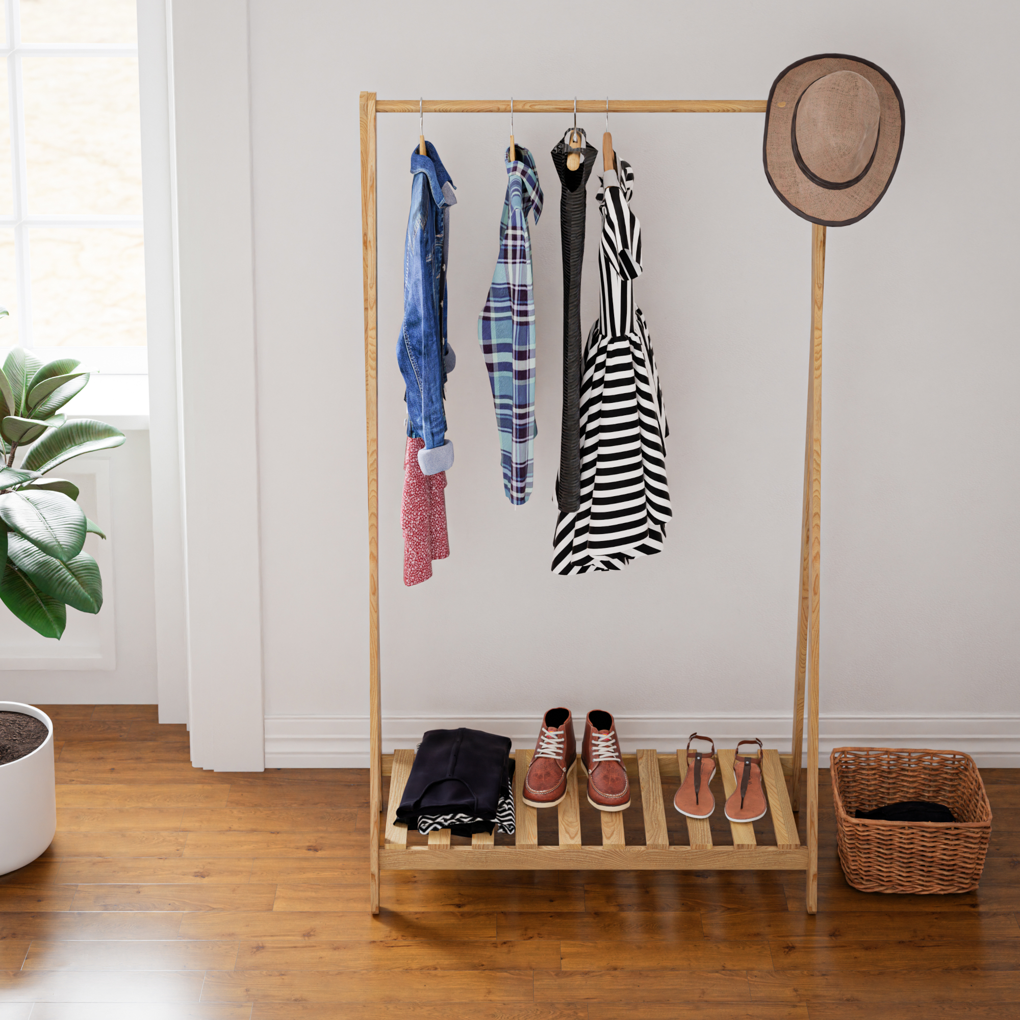 Suportul practic si stabil pentru haine din lemn natural de pin poate fi montat rapid si usor. Are o sina pentru umerase si va permite sa aveti mereu la indemana imbracamintea preferata si un raft ce ofera spatiu ideal pentru depozitarea pantofilor sau a gentilor.