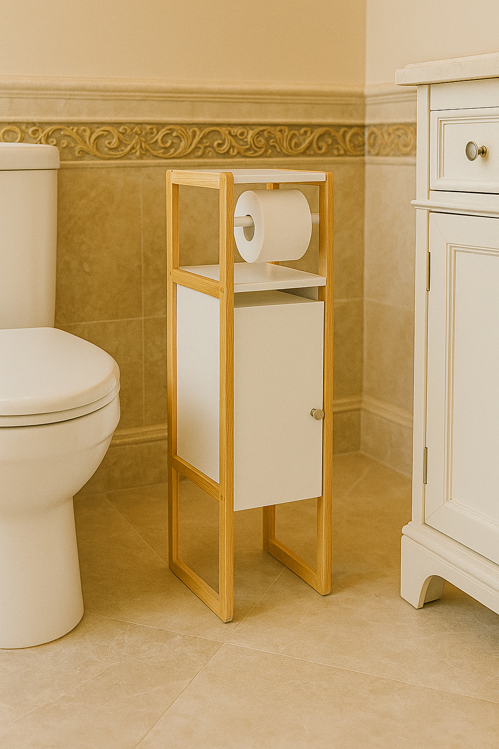 Utilizare: Așază suportul pe podea, lângă vasul de toaletă, pentru a avea la îndemână hârtia igienică și alte produse de igienă. Este potrivit pentru băi de apartament, case de vacanță sau spații pentru oaspeți.