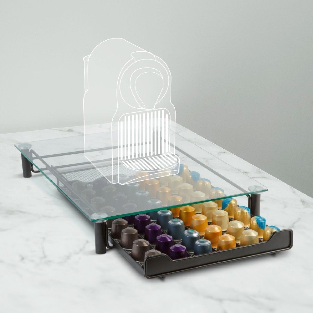 Designul modern, în nuanță negru mat, este completat de un capac din sticlă securizată, ce oferă un aspect premium și discret. Suportul poate depozita până la 60 de capsule Nespresso, așezate în 6 rânduri a câte 10 bucăți, astfel încât să ai mereu sortimentele preferate la vedere.