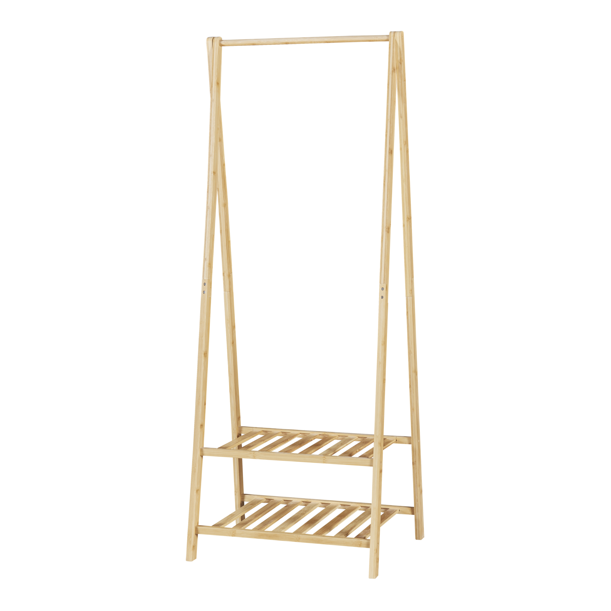 Prevăzut cu o bară pentru haine și două rafturi spațioase, suportul permite păstrarea la îndemână a jachetelor, paltoanelor, eșarfelor, genților sau încălțămintei. Materialul din bambus natural adaugă un plus de căldură vizuală și se integrează ușor în decoruri scandinave, minimaliste sau naturale.