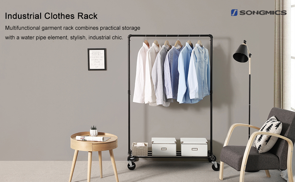 Suport pentru haine Songmics cu roti si raft, metal, 100x49x163 cm