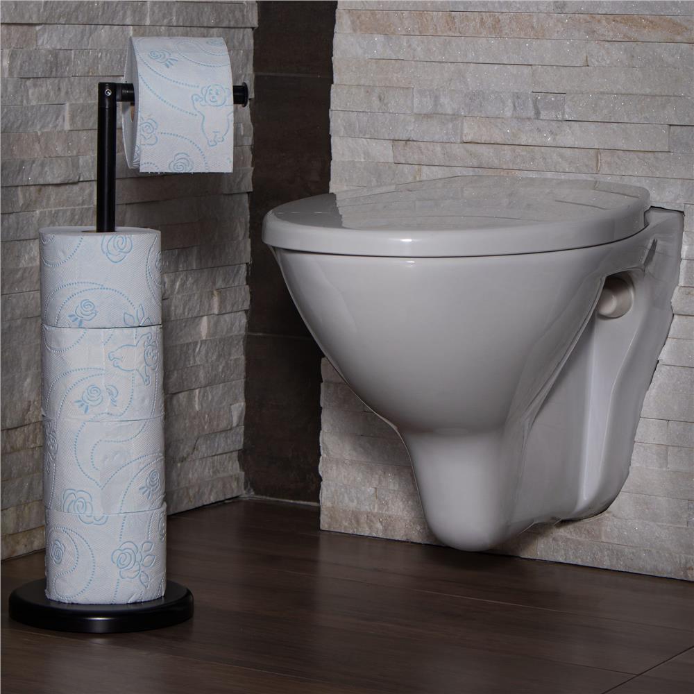Utilizare: amplaseaza suportul langa vasul de toaleta, incarca rolele de rezerva pe tija verticala si fixeaza rola activa pe brat. Este usor de integrat in bai de apartament, case, pensiuni sau spatii de oaspeti.