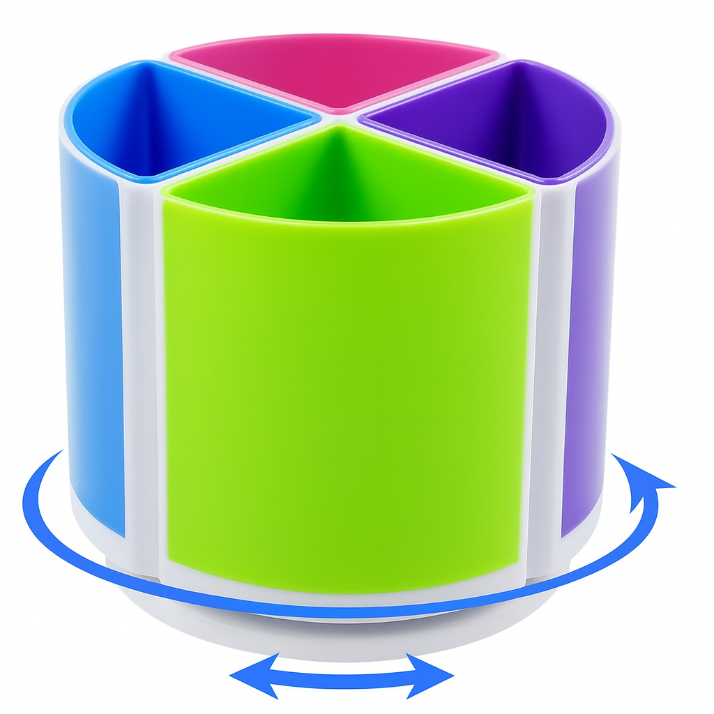 Organizează-ți rapid spațiul de lucru cu un suport rotativ pentru pixuri practic și colorat, ideal pentru birou, școală sau acasă. Baza cu rotație 360° îți oferă acces imediat la toate instrumentele, iar cele 4 compartimente detașabile te ajută să le separi pe categorii.