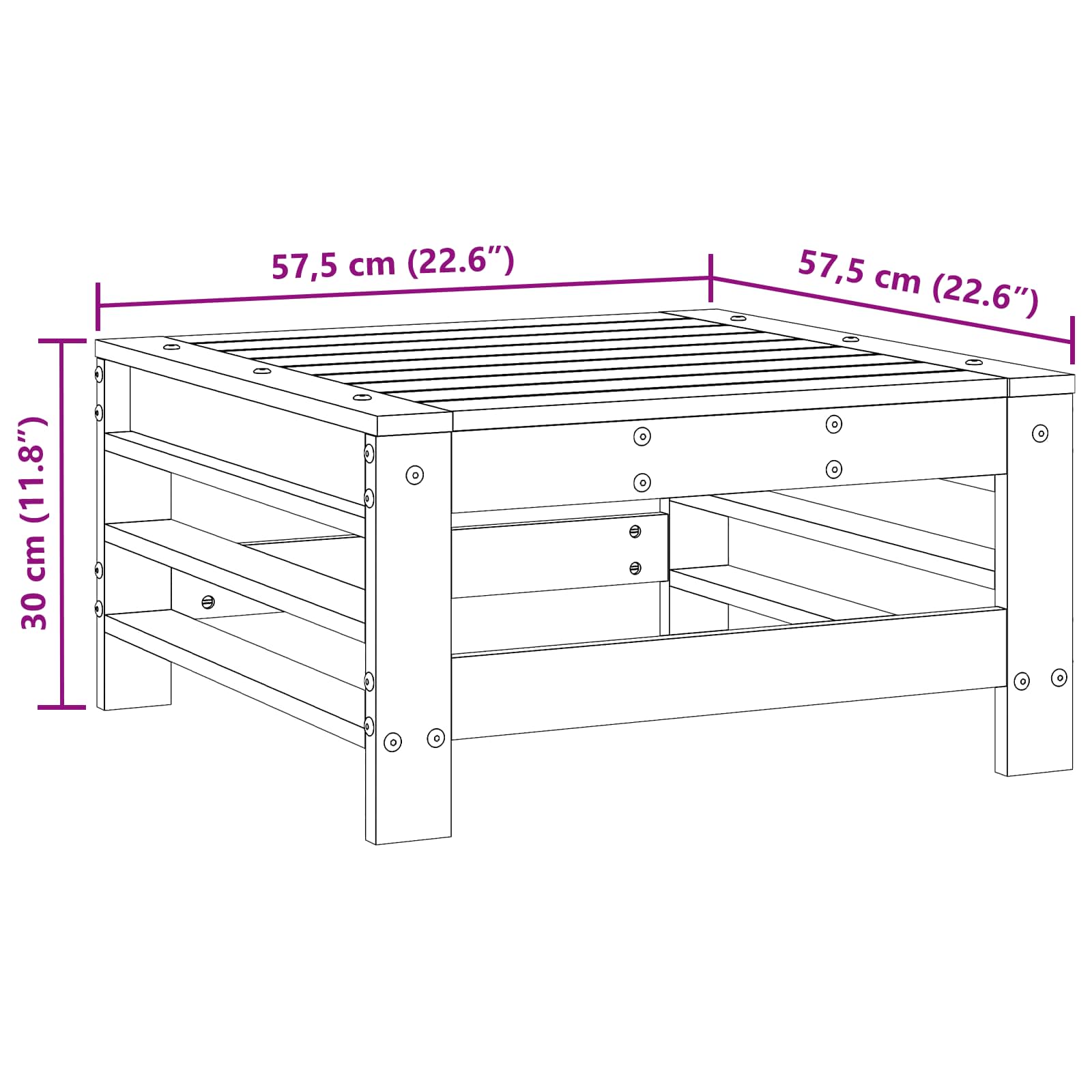 - Dimensiuni generale: 57,5 x 57,5 x 30 cm (L x l x î)
