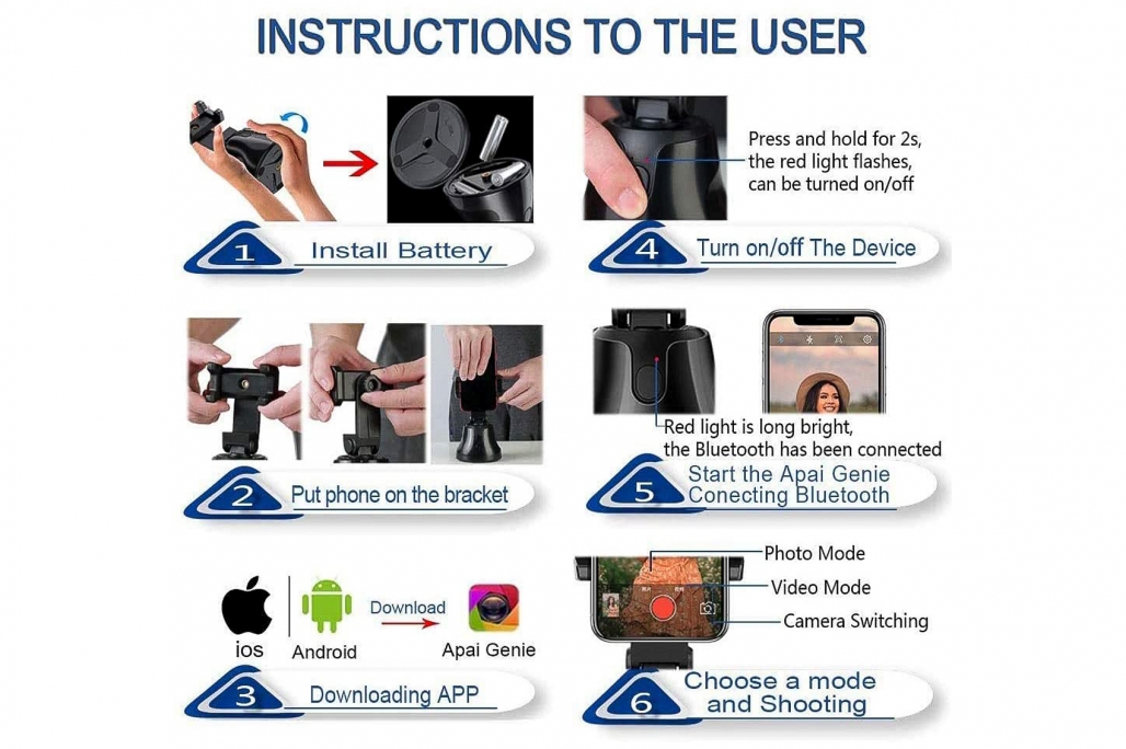 1 Instalati bateriile 2 Puneti telefonul mobil pe suport. 3 Descarcati APP „Apai Genie” din magazinele de aplicatii sau pe Google Play. 4 Apasati tasta de pornire timp de 2 secunde, lumina rosie se va aprinde inetermitent. 5 Conectarea la Bluetooth si a aplicatiei „Apai Genie”: mai intai, deschideti Bluetooth. In al doilea rand, deschideti aplicatia „Apai Genie”.