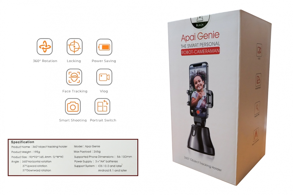 Suportul pentru telefonul mobil de urmarire automata a fetei a fost actualizat atat in software, cat si in hardware cu rata maxima de sping de pana la 180 ° pe secunda, in prezent cea mai rapida viteza de urmarire de pe piata. Lasati-va telefonul sa va urmeze si sa va faceti selfie-uri, nu mai trebuie sa cereti ajutor. Suportul pentru telefonul mobil poate urmari fetele si obiectele in timp real, de exemplu, atunci cand cainele se misca, telefonul mobil il urmareste pe caine si apoi fotografiaza automat. Suportul pentru telefonul mobil introduce tehnologia AI de compozitie a imaginii umane si estimarea scalei in fotografierea inteligenta, se roteste 360 de grade si recunoaste automat persoana/animalul. Cand mergeti, telefonul mobil se va intoarce in locul in care doriti sa mergeti, va seta poza si va face fotografii automat la un interval fix de 3 secunde. Puteti chiar sa va setati suportul pentru telefonul mobil pe un trepied. Pot fi montate mai multe telefoane mobile de la 5,7 cm la 12,3 cm * veti avea nevoie de trei baterii alcaline AA
