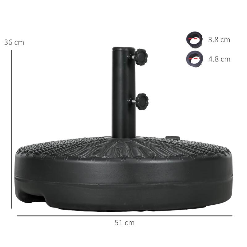 - Informații despre Produs: Dimensiuni totale: Φ51 x 36Hcm. Dimensiunile bazei: Φ50 x14Hcm. Dimensiunile stâlpului: Φ5,6 x 35Hcm. SKU-ul umbrelei părinte potrivite de la Outsunny: X-84D-018, 84D-032. Este necesară asamblarea. Notă: Vă rugăm să măsurați în prealabil stâlpul umbrelei dvs. pentru a vă asigura că se potrivește cu baza noastră.