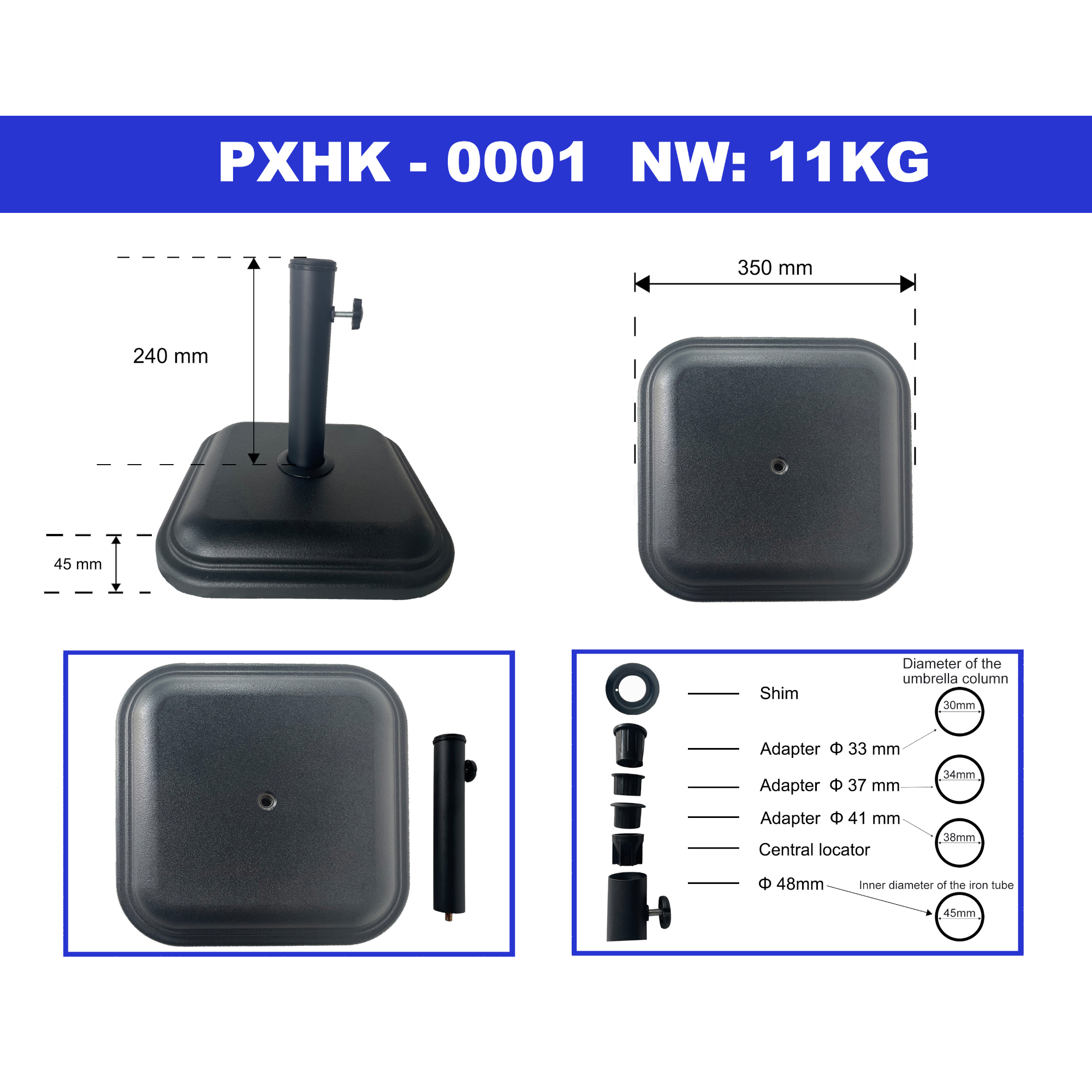 Este ideal ca picior pentru umbrelă de grădină în curte, pe terasă sau în zona de relaxare. Alegeți adaptorul potrivit pentru diametrul tijei, introduceți umbrela în tubul suport și fixați-o simplu cu ajutorul șurubului lateral.